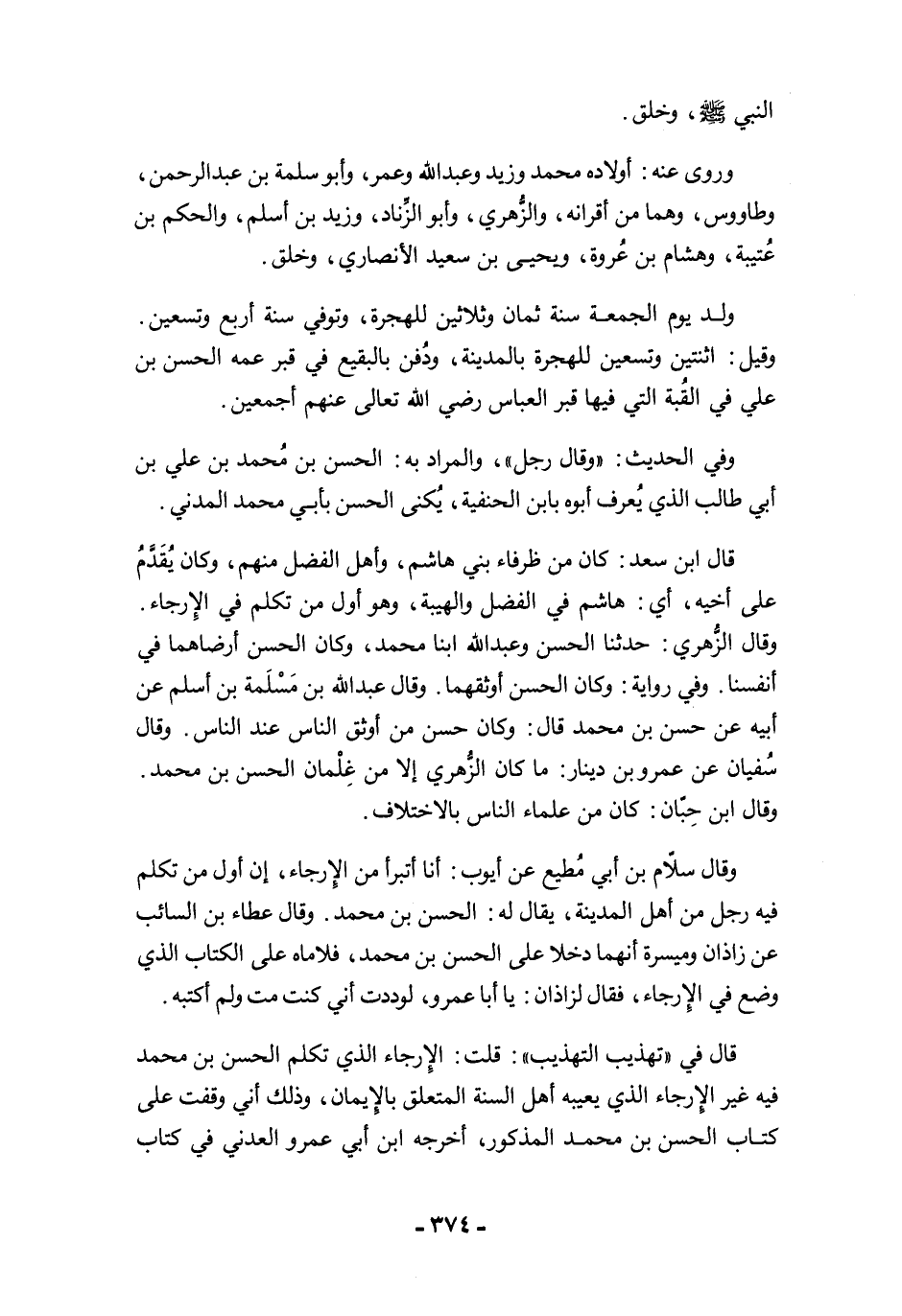 قال في "تهذيب التهذيب": قلت: الإرجاء الذي تكلم الحسن بن محمد فيه غير الإرجاء الذي يعيبه أهل السنة المتعلق بالإيمان، وذلك أني وقفت على كتاب الحسن بن محمد المذكور، أخرجه ابن أبي عمرو العدني في كتاب