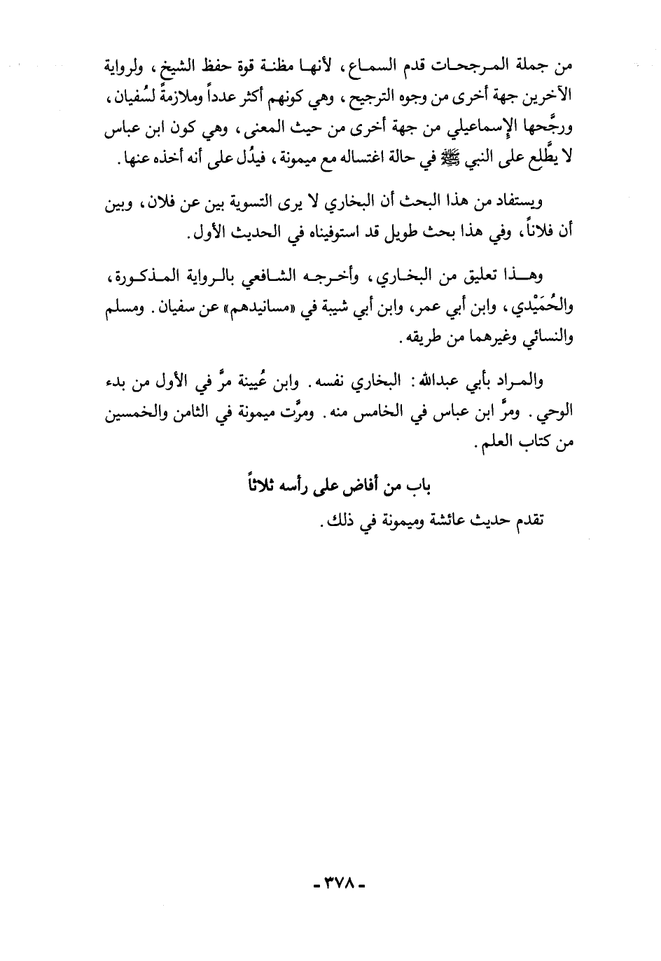 من جملة المرجحات قدم السماع؛ لأنها مظنة قوة حفظ الشيخ، ولرواية الآخرين جهة أخرى من وجوه الترجيح، وهي كونهم أكثر عددًا وملازمةً لسُفيان، ورجَّحها الإسماعيلي من جهة أخرى من حيث المعنى، وهي كون ابن عباس لا يطَّلع على النبي -صلى الله عليه وسلم- في حالة اغتساله مع ميمونة، فيدُل على أنه أخذه عنها.