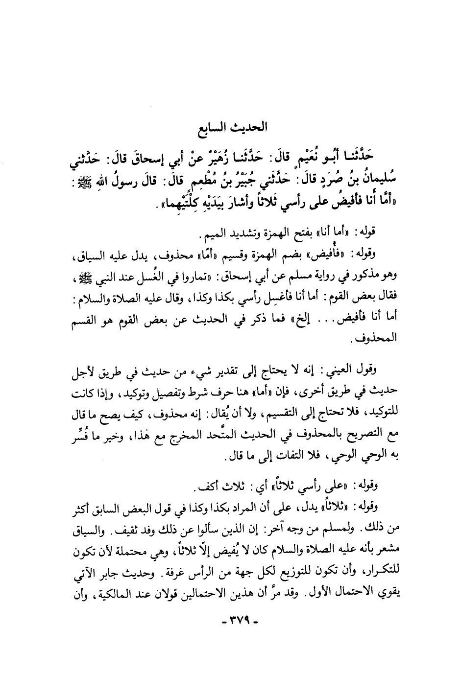 حَدَّثَنَا أَبُو نُعَيْمٍ قَالَ: حَدَّثَنَا زُهَيْرٌ عَنْ أَبِي إِسْحَاقَ قَالَ: حَدَّثَنِي سُلَيْمَانُ بْنُ صُرَدٍ قَالَ: حَدَّثَنِي جُبَيْرُ بْنُ مُطْعِمٍ قَالَ: قَالَ رَسُولُ اللَّهِ -صلى الله عليه وسلم-: "أَمَّا أَنَا فَأُفِيضُ عَلَى رَأْسِى ثَلاَثًا". وَأَشَارَ بِيَدَيْهِ كِلْتَيْهِمَا.