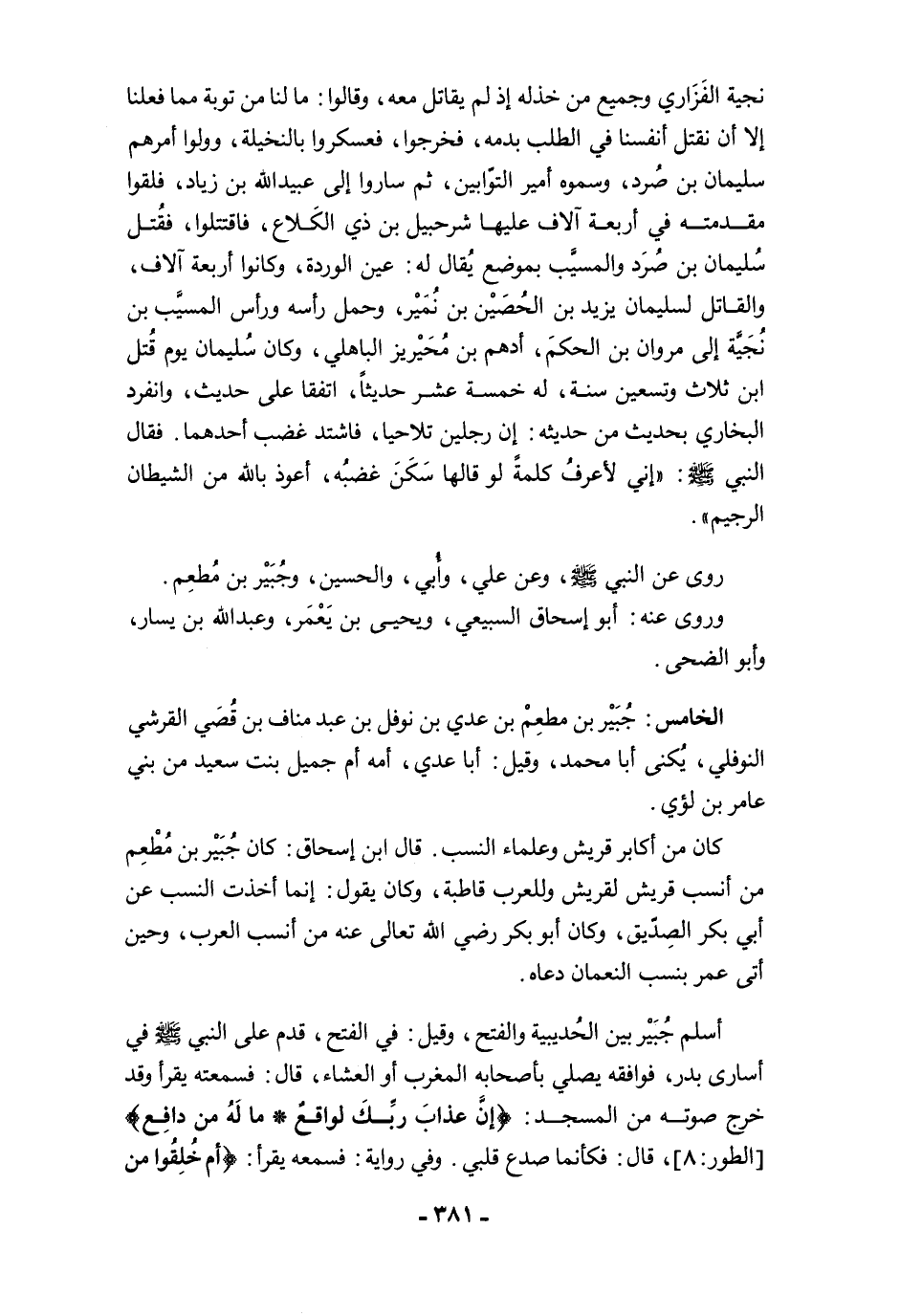 الخامس: جُبَيْر بن مطعِمْ بن عدي بن نوفل بن عبد مناف بن قُصَي القرشي النوفلي، يُكنى أبا محمد، وقيل: أبا عدي، أمه أم جميل بنت سعيد من بني عامر بن لؤي.