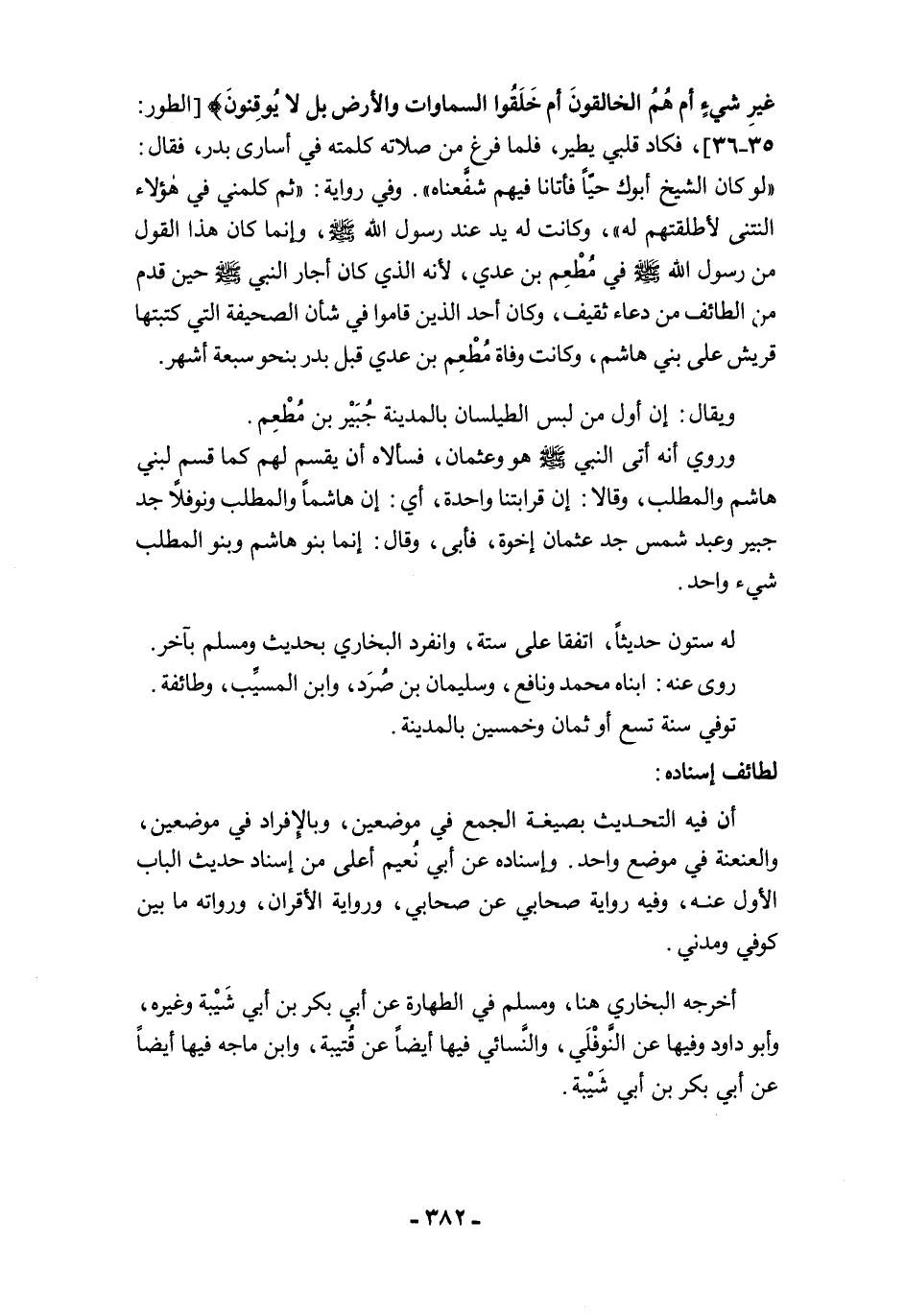 غَيْرِ شَيْءٍ أَمْ هُمُ الْخَالِقُونَ (35) أَمْ خَلَقُوا السَّمَاوَاتِ وَالْأَرْضَ بَلْ لَا يُوقِنُونَ (36)} [الطور: 35 - 36]، فكاد قلبي يطير، فلما فرغ من صلاته كلمته في أسارى بدر، فقال: "لو كان الشيخ أبوك حيًّا فأتانا فيهم شفَّعناه". وفي رواية: "ثم كلمني في هؤلاء النتنى لأطلقتهم له"، وكانت له يد عند رسول الله -صلى الله عليه وسلم-، وإنما كان هذا القول من رسول الله -صلى الله عليه وسلم- في مُطْعِم بن عدي؛ لأنه الذي كان أجار النبي -صلى الله عليه وسلم- حين قدم من الطائف من دعاء ثقيف، وكان أحد الذين قاموا في شأن الصحيفة التي كتبتها قريش علي بني هاشم، وكانت وفاة مُطْعِم بن عدي قبل بدر بنحو سبعة أشهر.