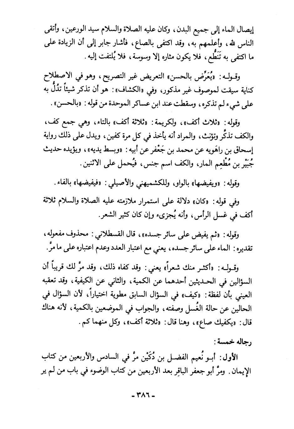 إيصال الماء إلى جميع البدن، وكان عليه الصلاة والسلام سيد الورعين، وأتقى الناس لله، وأعلمهم به، وقد اكتفى بالصاع، فأشار جابر إلى أن الزيادة على ما اكتفى به تَنَطُّع، فلا يكون مثاره إلا وسوسة، فلا يُلتفت إليه.