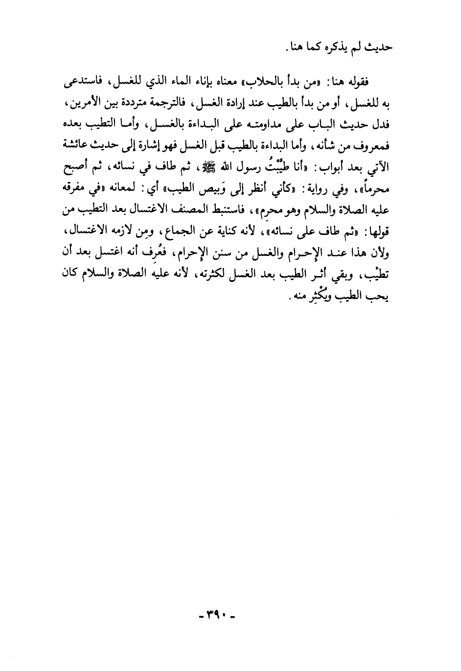 فقوله هنا: "من بدأ بالحلاب" معناه بإناء الماء الذي للغسل، فاستدعى به للغسل، أو من بدأ بالطيب عند إرادة الغسل، فالترجمة مترددة بين الأمرين، فدل حديث الباب على مداومته على البداءة بالغسل، وأما التطيب بعده فمعروف من شأنه، وأما البداءة بالطيب قبل الغسل فهو إشارة إلى حديث عائشة الآتي بعد أبواب: "أنا طيَّبْتُ رسول الله -صلى الله عليه وسلم-، ثم طاف في نسائه، ثم أصبح محرمًا"، وفي رواية: "كأني انظر إلى وَبيص الطيب" أي: لمعانه "في مفرقه عليه الصلاة والسلام وهو محرِم"، فاستنبط المصنف الاغتسال بعد التطيب من قولها: "ثم طاف على نسائه"؛ لأنه كناية عن الجماع، ومِن لازمه الاغتسال، ولأن هذا عند الإحرام والغسل من سنن الإحرام، فعُرِف أنه اغتسل بعد أن تطيب، وبقي أثر الطيب بعد الغسل لكثرته؛ لأنه عليه الصلاة والسلام كان يحب الطيب ويُكْثِر منه.