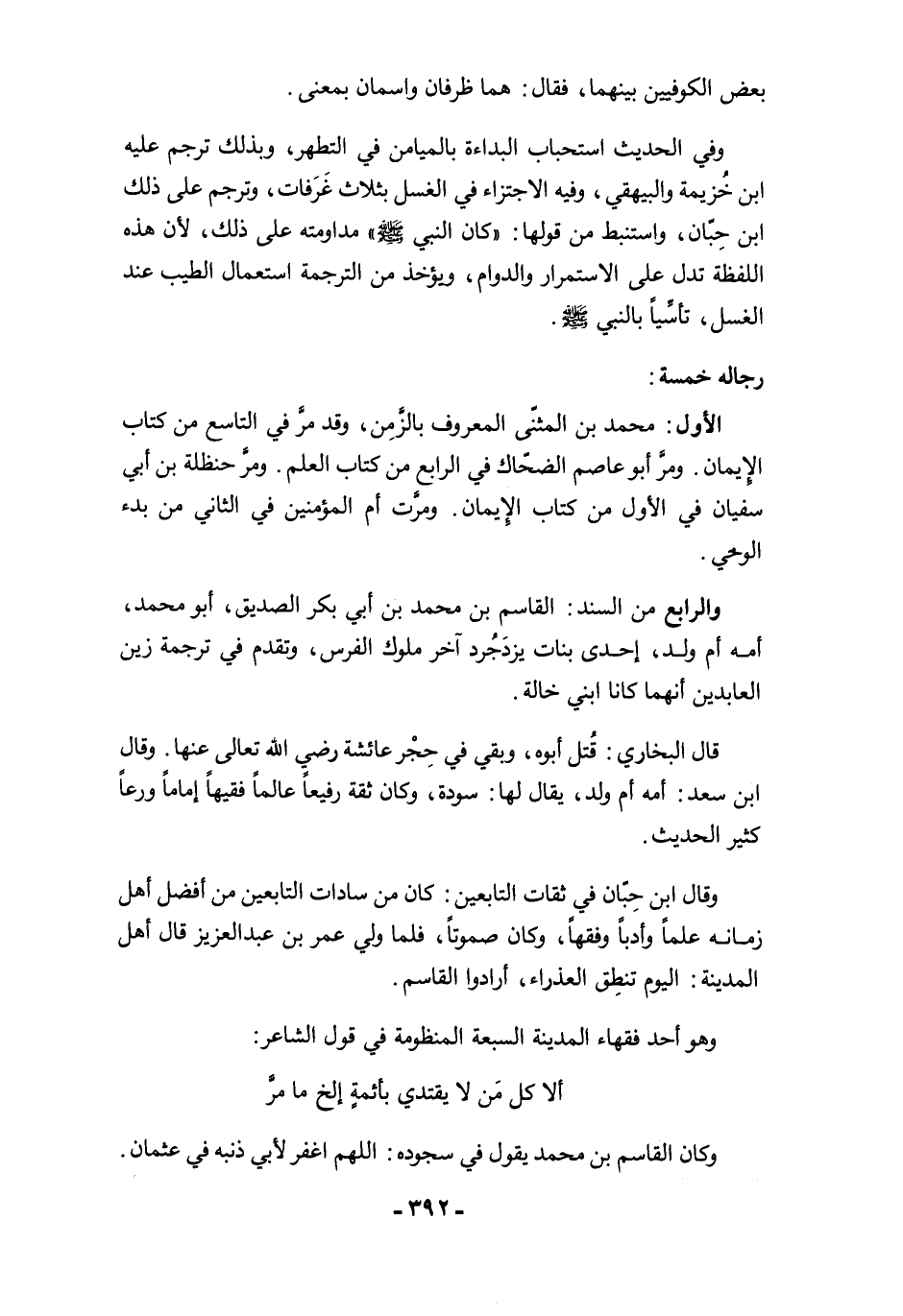 الأول: محمد بن المثنّى المعروف بالزَّمِن، وقد مر في التاسع من كتاب الإيمان. ومرَّ أبو عاصم الضحّاك في الرابع من كتاب العلم. ومرَّ حنظلة بن أبي سفيان في الأول من كتاب الإِيمان. ومرت أم المؤمنين في الثاني من بدء الوحي.