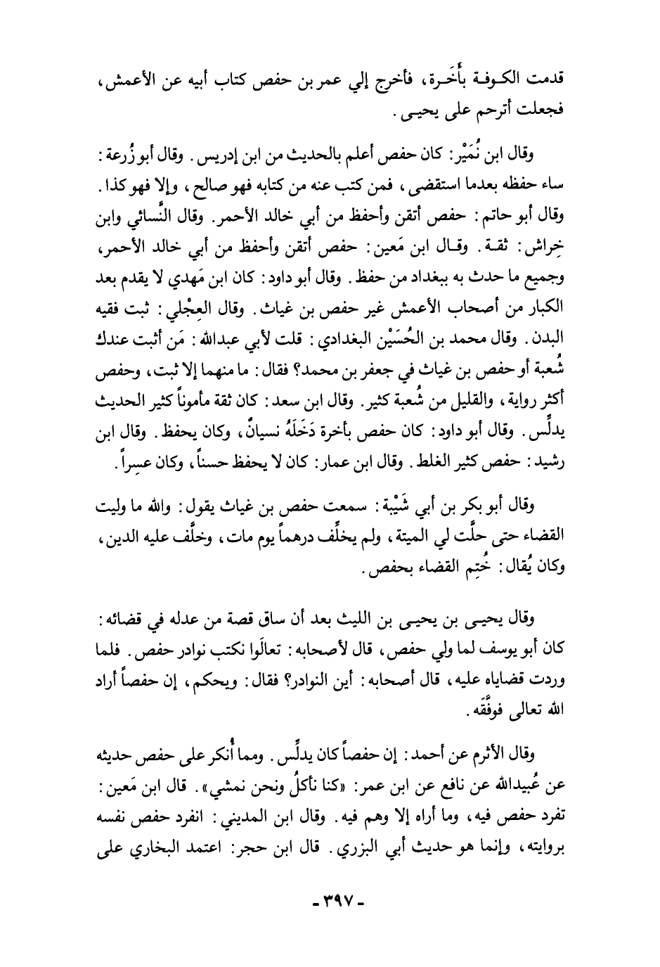وقال ابن نُمَيْر: كان حفص أعلم بالحديث من ابن إدريس. وقال أبو زُرعة: ساء حفظه بعدما استقضى، فمن كتب عنه من كتابه فهو صالح، وإلا فهو كذا. وقال أبو حاتم: حفص أتقن وأحفظ من أبي خالد الأحمر. وقال النَّسائي وابن خِراش: ثقة. وقال ابن مَعين: حفص أتقن وأحفظ من أبي خالد الأحمر، وجميع ما حدث به ببغداد من حفظ. وقال أبو داود: كان ابن مَهدي لا يقدم بعد الكبار من أصحاب الأعمش غير حفص بن غياث. وقال العِجْلي: ثبت فقيه البدن. وقال محمد بن الحُسَيْن البغدادي: قلت لأبي عبد الله: مَن أثبت عندك شُعبة أو حفص بن غياث في جعفر بن محمد؟ فقال: ما منهما إلا ثبت، وحفص أكثر رواية، والقليل من شُعبة كثير. وقال ابن سعد: كان ثقة مأمونًا كثير الحديث يدلِّس. وقال أبو داود: كان حفص بأخرة دَخَلَهُ نسيانٌ، وكان يحفظ. وقال ابن رشيد: حفص كثير الغلط. وقال ابن عمار: كان لا يحفظ حسنًا، وكان عسِرًا.