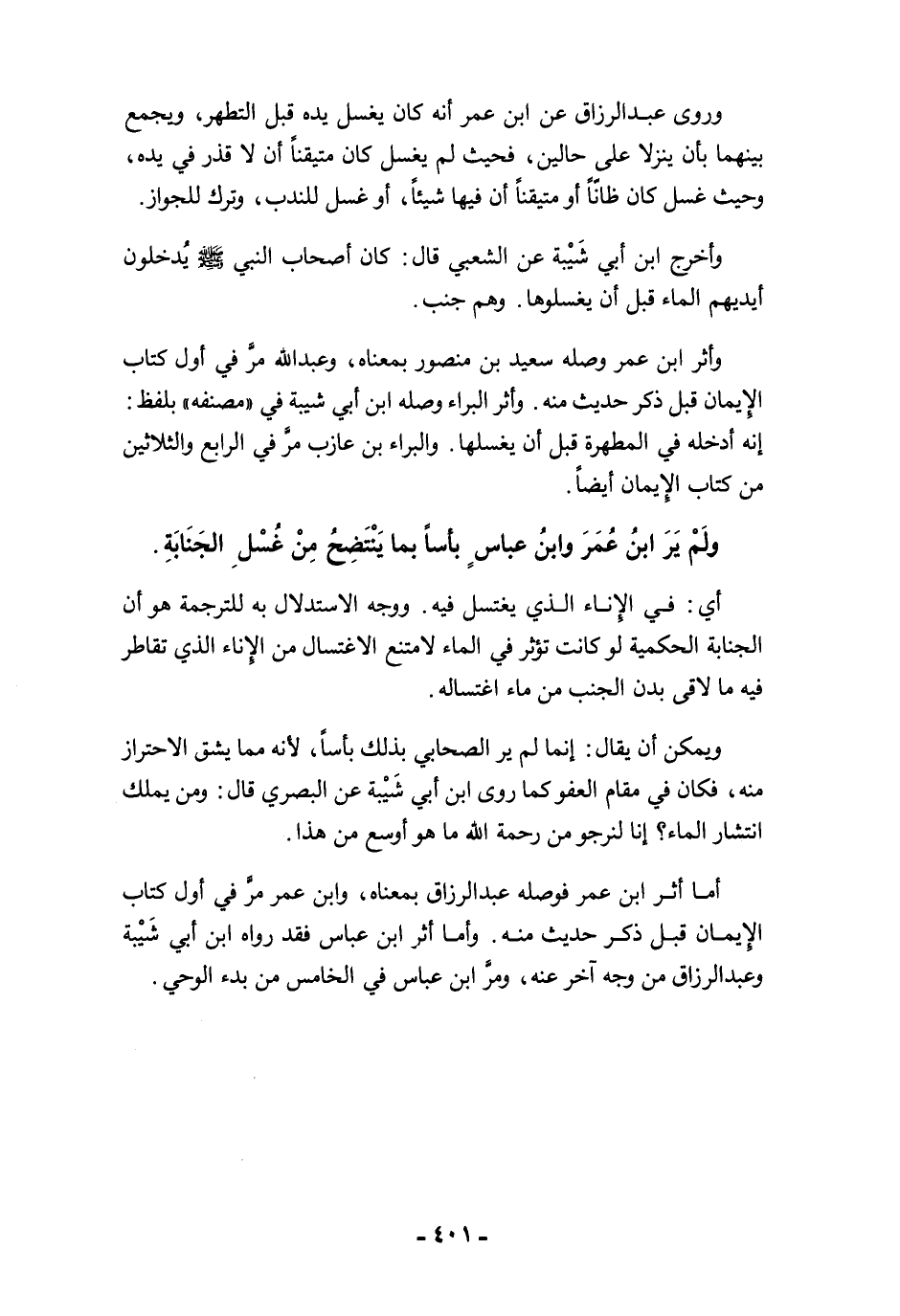 وأثر ابن عمر وصله سعيد بن منصور بمعناه، وعبد الله مرَّ في أول كتاب الإيمان قبل ذكر حديث منه. وأثر البراء وصله ابن أبي شيبة في "مصنفه" بلفظ: إنه أدخله في المطهرة قبل أن يغسلها. والبراء بن عازب مرَّ في الرابع والثلاثين من كتاب الإيمان أيضًا.