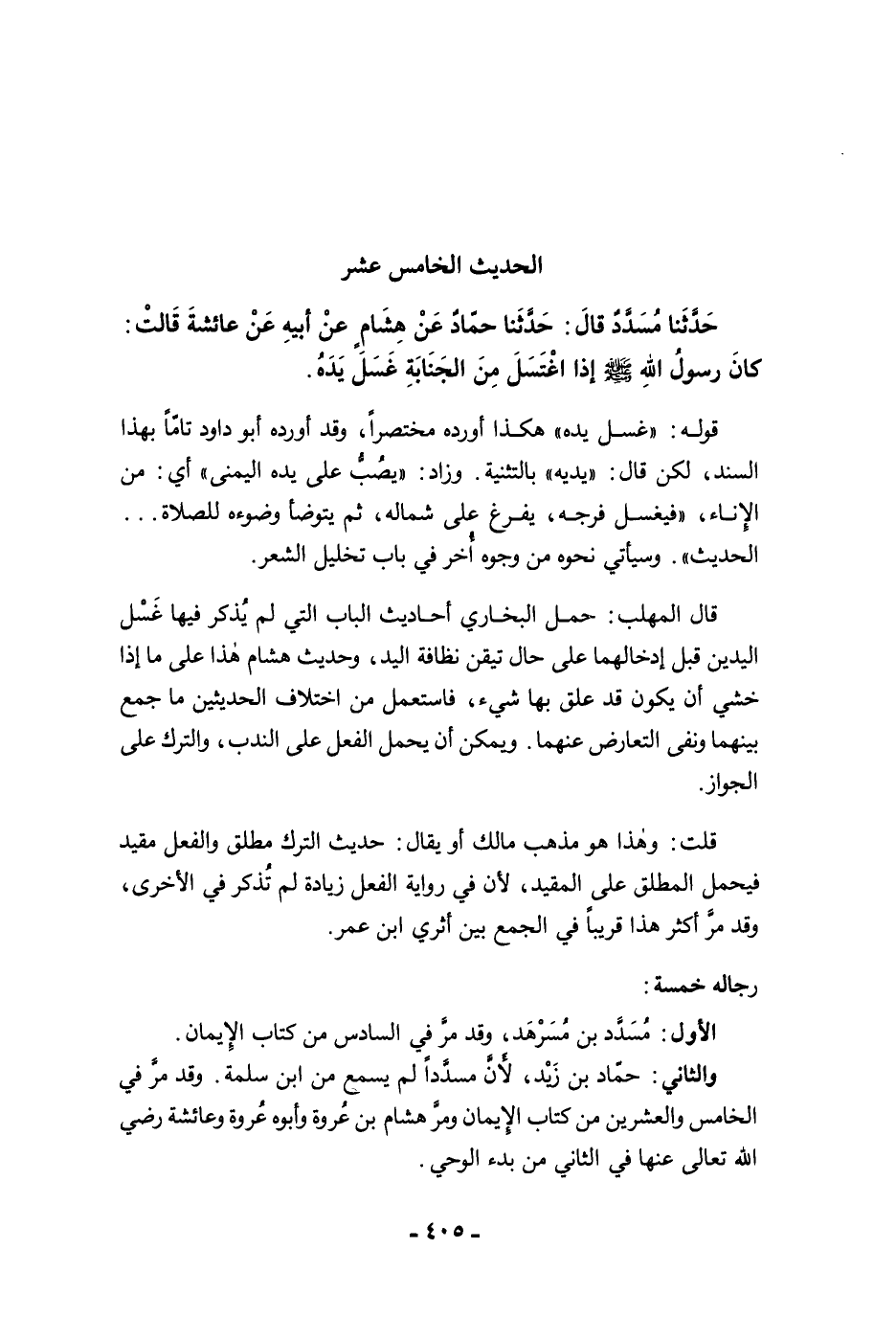 حَدَّثَنَا مُسَدَّدٌ قَالَ: حَدَّثَنَا حَمَّادٌ عَنْ هِشَامٍ عَنْ أَبِيهِ عَنْ عَائِشَةَ قَالَتْ: كَانَ رَسُولُ اللَّهِ -صلى الله عليه وسلم- إِذَا اغْتَسَلَ مِنَ الْجَنَابَةِ غَسَلَ يَدَهُ.