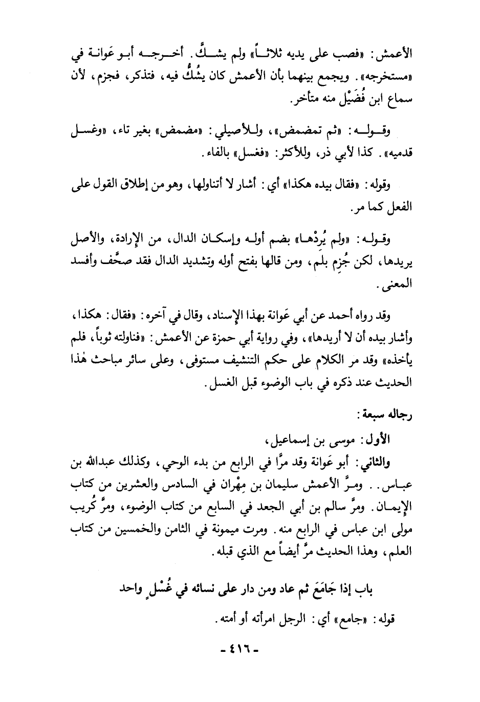 والثاني: أبو عَوانة وقد مرَّا في الرابع من بدء الوحي، وكذلك عبد الله بن عباس .. ومرَّ الأعمش سليمان بن مِهْران في السادس والعشرين من كتاب الإِيمان. ومرَّ سالم بن أبي الجعد في السابع من كتاب الوضوء، ومرَّ كُريب مولى ابن عباس في الرابع منه. ومرت ميمونة في الثامن والخمسين من كتاب العلم، وهذا الحديث مرَّ أيضًا مع الذي قبله.