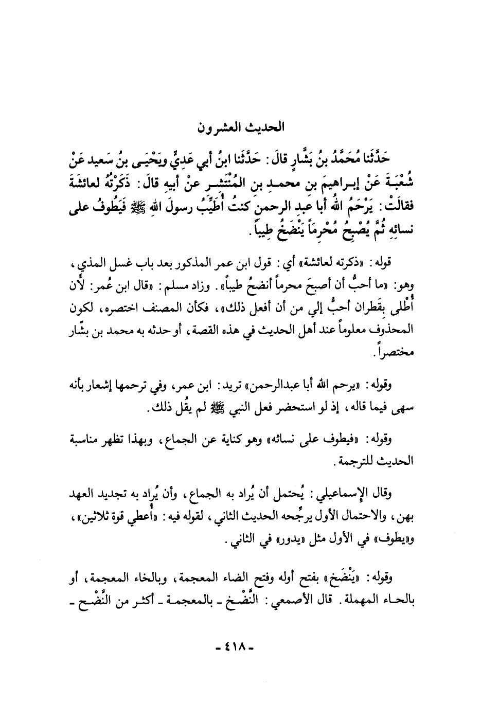 حَدَّثَنَا مُحَمَّدُ بْنُ بَشَّارٍ قَالَ: حَدَّثَنَا ابْنُ أَبِى عَدِيٍّ وَيَحْيَى بْنُ سَعِيدٍ عَنْ شُعْبَةَ عَنْ إِبْرَاهِيمَ بْنِ مُحَمَّدِ بْنِ الْمُنْتَشِرِ عَنْ أَبِيهِ قَالَ: ذَكَرْتُهُ لِعَائِشَةَ فَقَالَتْ: يَرْحَمُ اللَّهُ أَبَا عَبْدِ الرَّحْمَنِ، كُنْتُ أُطَيِّبُ رَسُولَ اللَّهِ -صلى الله عليه وسلم-، فَيَطُوفُ عَلَى نِسَائِهِ، ثُمَّ يُصْبِحُ مُحْرِمًا يَنْضَخُ طِيبًا.