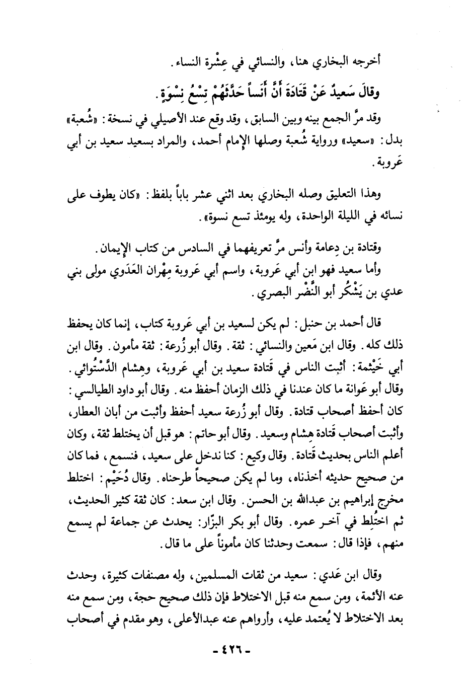 وقال ابن عَدي: سعيد من ثقات المسلمين، وله مصنفات كثيرة، وحدث عنه الأئمة، ومن سمع منه قبل الاختلاط فإن ذلك صحيح حجة، ومن سمع منه بعد الاختلاط لا يُعتمد عليه، وأرواهم عنه عبد الأعلى، وهو مقدم في أصحاب