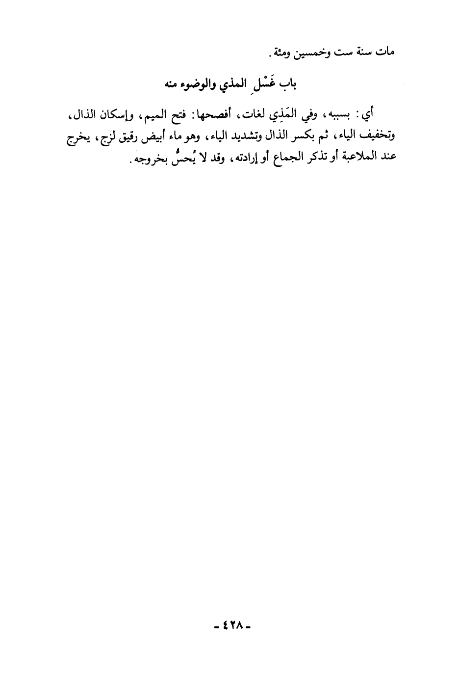 أي: بسببه، وفي المَذِي لغات، أفصحها: فتح الميم، وإسكان الذال، وتخفيف الياء، ثم بكسر الذال وتشديد الياء، وهو ماء أبيض رقيق لزج، يخرج عند الملاعبة أو تذكر الجماع أو إرادته، وقد لا يُحسُّ بخروجه.