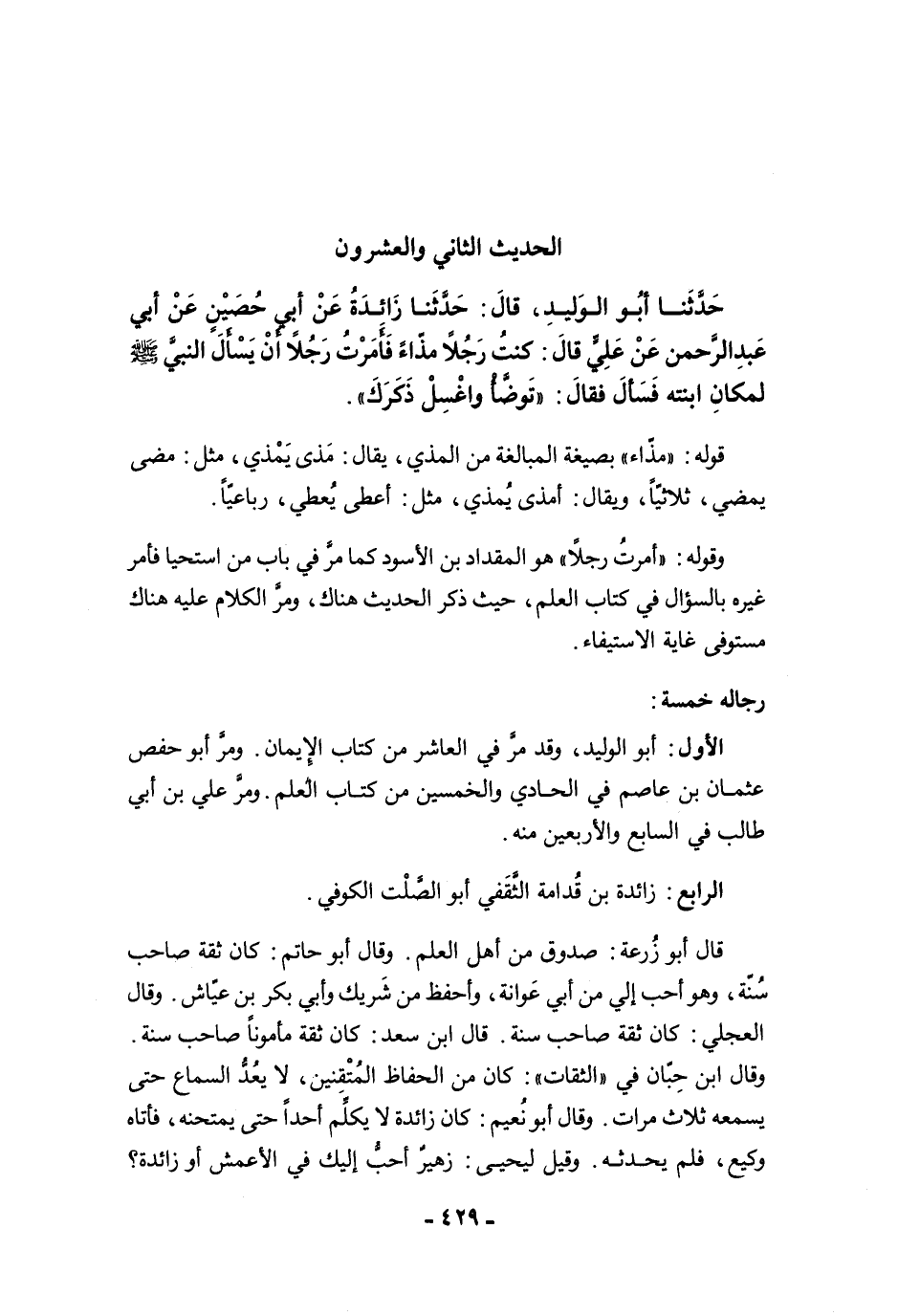 حَدَّثَنَا أَبُو الْوَلِيدِ، قَالَ: حَدَّثَنَا زَائِدَةُ عَنْ أَبِي حَصِينٍ عَنْ أَبِي عَبْدِ الرَّحْمَنِ عَنْ عَلِيٍّ قَالَ: كُنْتُ رَجُلاً مَذَّاءً فَأَمَرْتُ رَجُلاً أَنْ يَسْأَلَ النَّبِيَّ -صلى الله عليه وسلم- لِمَكَانِ ابْنَتِهِ فَسَأَلَ فَقَالَ: "تَوَضَّأْ وَاغْسِلْ ذَكَرَكَ".