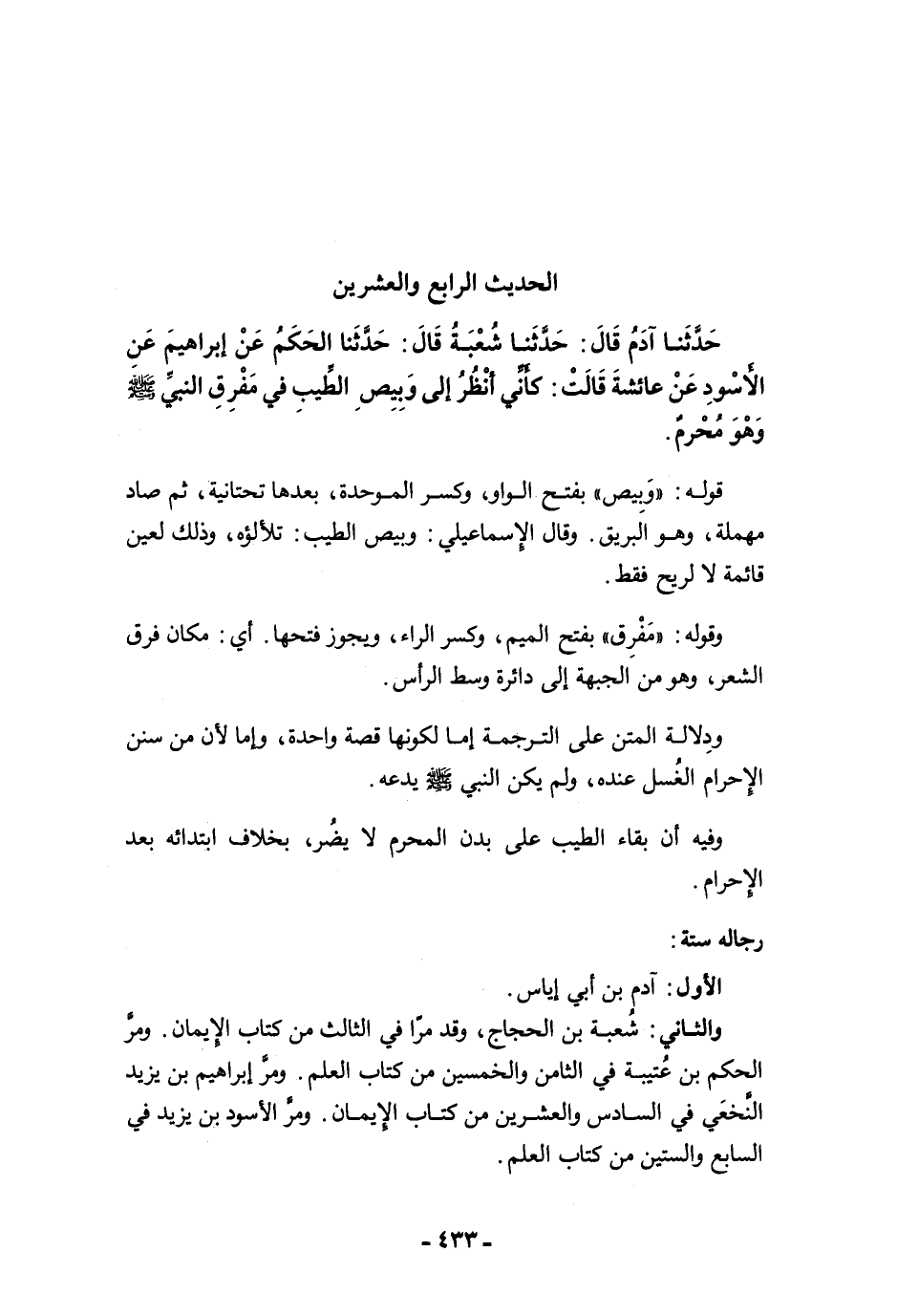 حَدَّثَنَا آدَمُ قَالَ: حَدَّثَنَا شُعْبَةُ قَالَ: حَدَّثَنَا الْحَكَمُ عَنْ إِبْرَاهِيمَ عَنِ الأَسْوَدِ عَنْ عَائِشَةَ قَالَتْ: كَأَنِّي أَنْظُرُ إِلَى وَبِيصِ الطِّيبِ فِى مَفْرِقِ النَّبِيِّ -صلى الله عليه وسلم- وَهْوَ مُحْرِمٌ.