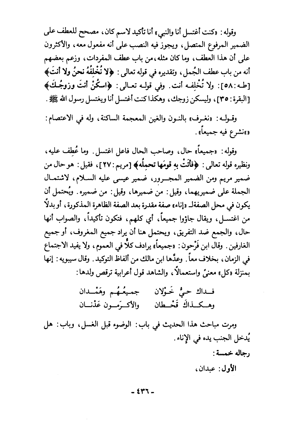 وقوله: "جميعًا" حال، وصاحب الحال فاعل اغتسل. وما عُطِف عليه، ونظيره قوله تعالى: {فَأَتَتْ بِهِ قَوْمَهَا تَحْمِلُهُ} [مريم: 27]، فقيل: هو حال من ضمير مريم ومن الضمير المجرور، ضمير عيسى عليه السلام، لاشتمال الجملة على ضميريهما، وقيل: من ضميرها، وقيل: من ضميره. ويُحتمل أن يكون في محل الصفة لـ"إناء" صفة مقدرة بعد الصفة الظاهرة المذكورة، أو بدلًا من اغتسل، ويقال جاؤوا جميعًا، أي كلهم، فتكون تأكيدًا، والصواب أنها حال، والجمع ضد التفريق، ويحتمل هنا أن يراد جميع المغروف، أو جميع الغارفين. وقال ابن فَرْحون: "جميعًا" يرادف كلاًّ في العموم، ولا يفيد الاجتماع في الزمان، بخلاف معًا. وعدَّها ابن مالك من ألفاظ التوكيد. وقال سيبويه: إنها بمنزلة "كل" معنىً واستعمالًا، والشاهد قول أعرابية ترقص ولدها: