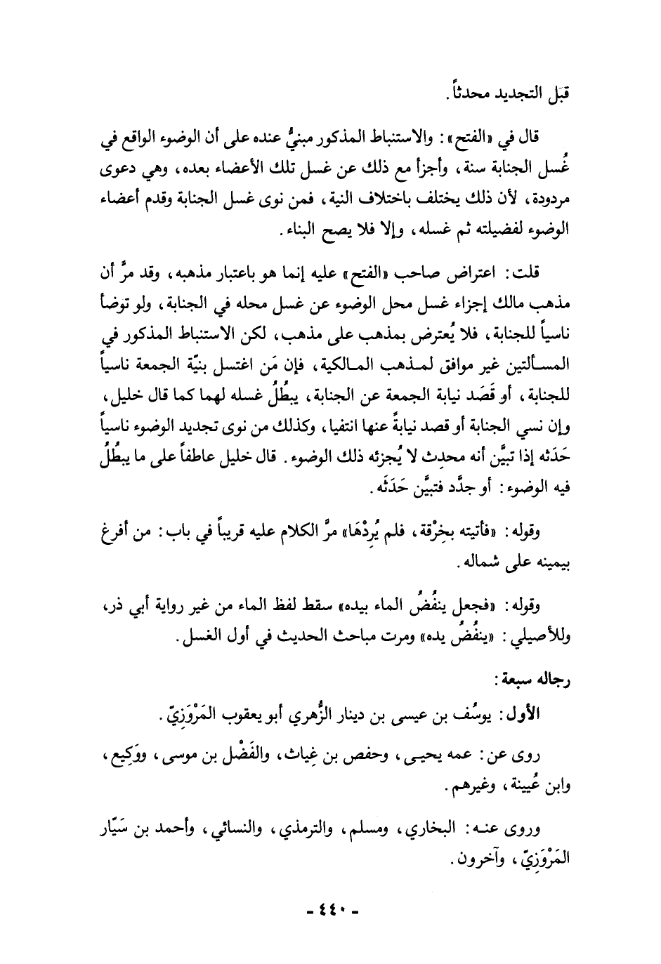 قلت: اعتراض صاحب "الفتح" عليه إنما هو باعتبار مذهبه، وقد مرَّ أن مذهب مالك إجزاء غسل محل الوضوء عن غسل محله في الجنابة، ولو توضأ ناسيًا للجنابة، فلا يُعترض بمذهب على مذهب، لكن الاستنباط المذكور في المسألتين غير موافق لمذهب المالكية، فإن مَن اغتسل بنيّة الجمعة ناسيًا للجنابة، أو قَصَد نيابة الجمعة عن الجنابة، يبطُلُ غسله لهما كما قال خليل، وإن نسي الجنابة أو قصد نيابةً عنها انتفيا، وكذلك من نوى تجديد الوضوء ناسيًا حَدَثه إذا تبيَّن أنه محدِث لا يُجزئه ذلك الوضوء. قال خليل عاطفًا على ما يبطُلُ فيه الوضوء: أو جدَّد فتبيَّن حَدَثَه.