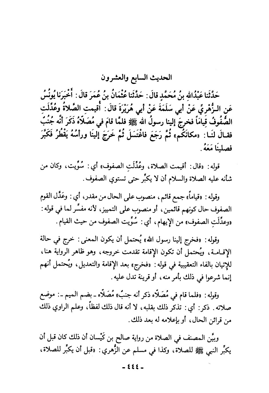حَدَّثَنَا عَبْدُ اللَّهِ بْنُ مُحَمَّدٍ قَالَ: حَدَّثَنَا عُثْمَانُ بْنُ عُمَرَ قَالَ: أَخْبَرَنَا يُونُسُ عَنِ الزُّهْرِيِّ عَنْ أَبِي سَلَمَةَ عَنْ أَبِي هُرَيْرَةَ قَالَ: أُقِيمَتِ الصَّلاَةُ، وَعُدِّلَتِ الصُّفُوفُ قِيَامًا، فَخَرَجَ إِلَيْنَا رَسُولُ اللَّهِ -صلى الله عليه وسلم- فَلَمَّا قَامَ فِي مُصَلاَّهُ ذَكَرَ أَنَّهُ جُنُبٌ فَقَالَ لَنَا: "مَكَانَكُمْ". ثُمَّ رَجَعَ فَاغْتَسَلَ، ثُمَّ خَرَجَ إِلَيْنَا وَرَأْسُهُ يَقْطُرُ، فَكَبَّرَ فَصَلَّيْنَا مَعَهُ.