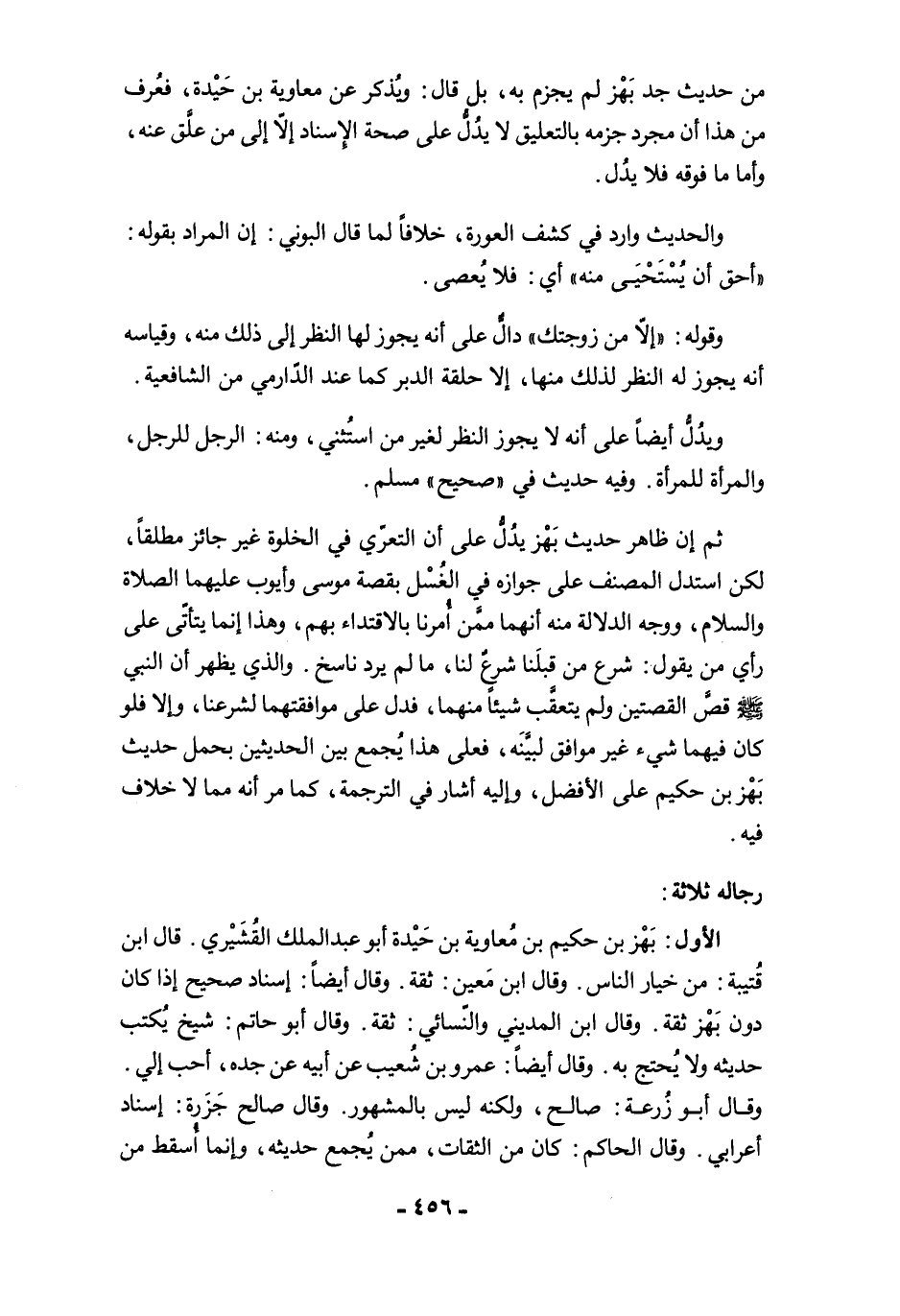 الأول: بَهْز بن حكيم بن مُعاوية بن حَيْدة أبو عبد الملك القُشَيْري. قال ابن قُتيبة: من خيار الناس. وقال ابن مَعين: ثقة. وقال أيضًا: إسناد صحيح إذا كان دون بَهْز ثقة. وقال ابن المديني والنّسائي: ثقة. وقال أبو حاتم: شيخ يُكتب حديثه ولا يُحتج به. وقال أيضًا: عمرو بن شُعيب عن أبيه عن جده، أحب إلى. وقال أبو زُرعة: صالح، ولكنه ليس بالمشهور. وقال صالح جَزَرة: إسناد أعرابي. وقال الحاكم: كان من الثقات، ممن يُجمع حديثه، وإنما أُسقط من