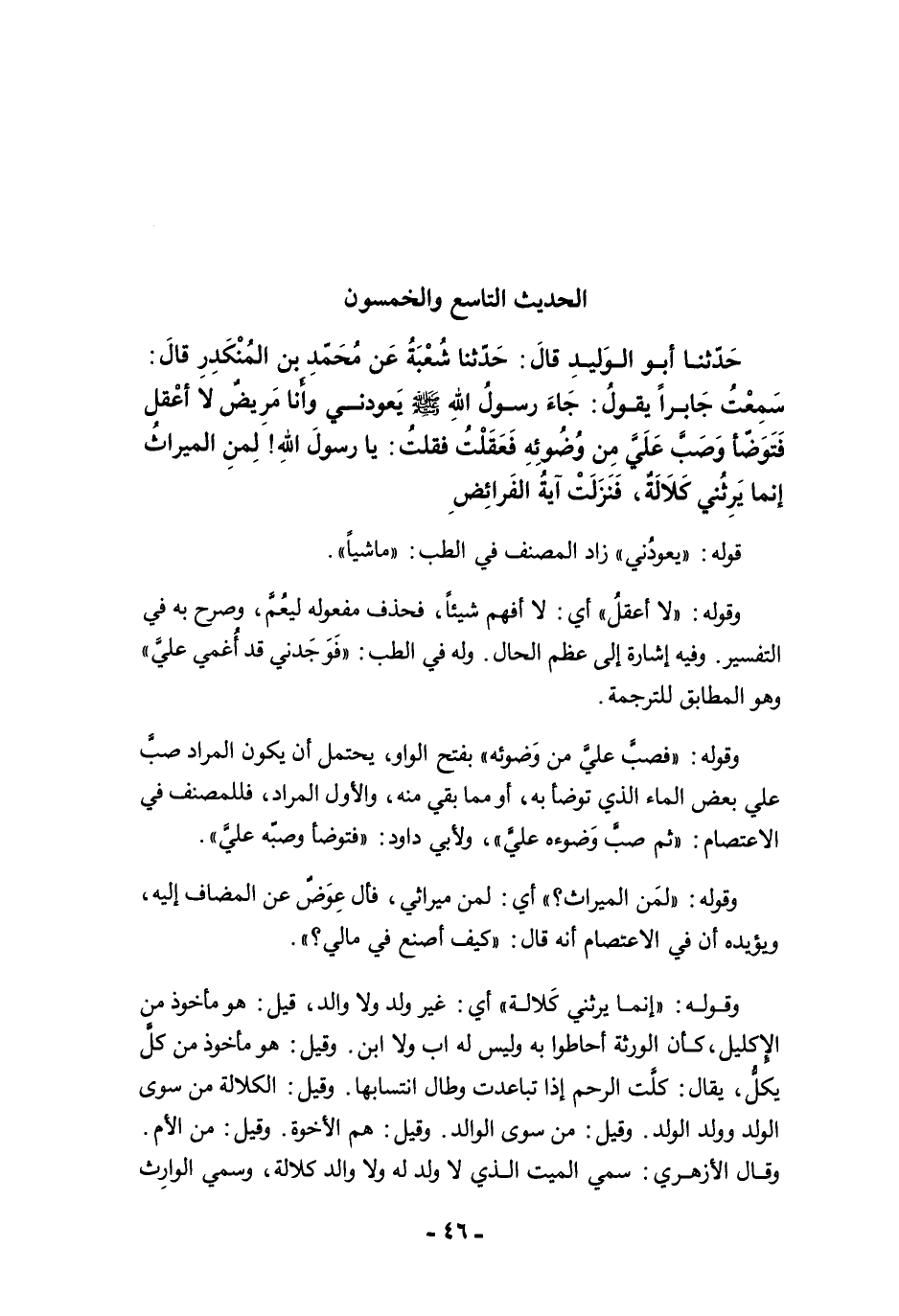 حَدَّثَنَا أَبُو الْوَلِيدِ قَالَ: حَدَّثَنَا شُعْبَةُ عَنْ مُحَمَّدِ بْنِ الْمُنْكَدِرِ قَالَ: سَمِعْتُ جَابِرًا يَقُولُ: جَاءَ رَسُولُ اللَّهِ -صلى الله عليه وسلم- يَعُودُنِي، وَأَنَا مَرِيضٌ لاَ أَعْقِلُ، فَتَوَضَّأَ وَصَبَّ عَلَيَّ مِنْ وَضُوئِهِ، فَعَقَلْتُ فَقُلْتُ: يَا رَسُولَ اللَّهِ! لِمَنِ الْمِيرَاثُ إِنَّمَا يَرِثُنِي كَلاَلَةٌ. فَنَزَلَتْ آيَةُ الْفَرَائِضِ.