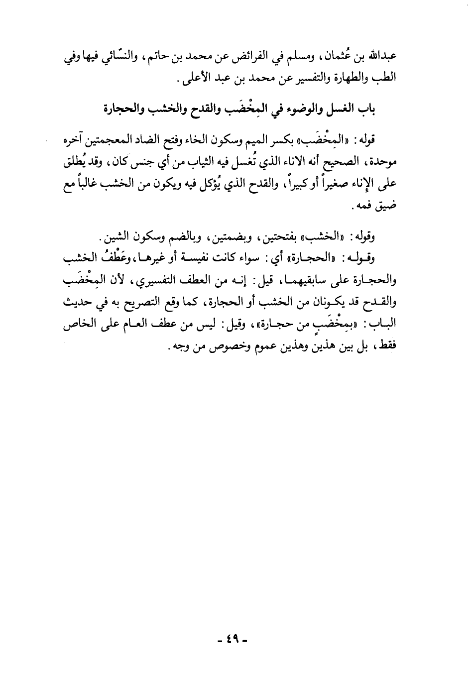وقوله: "الحجارة" أي: سواء كانت نفيسة أو غيرها، وعَطْفُ الخشب والحجارة على سابقيهما، قيل: إنه من العطف التفسيري؛ لأن المِخْضَب والقدح قد يكونان من الخشب أو الحجارة، كما وقع التصريح به في حديث الباب: "بمِخْضَبٍ من حجارة"، وقيل: ليس من عطف العام على الخاص فقط، بل بين هذين وهذين عموم وخصوص من وجه.