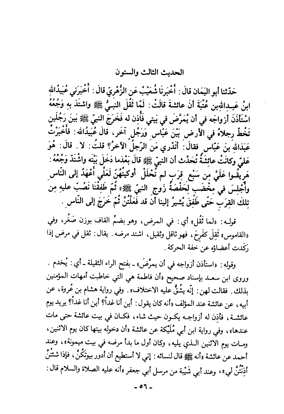حَدَّثَنَا أَبُو الْيَمَانِ قَالَ: أَخْبَرَنَا شُعَيْبٌ عَنِ الزُّهْرِيِّ قَالَ أَخْبَرَنِي عُبَيْدُ اللَّهِ بْنُ عَبْدِ اللَّهِ بْنِ عُتْبَةَ أَنَّ عَائِشَةَ قَالَتْ: لَمَّا ثَقُلَ النَّبِيُّ -صلى الله عليه وسلم- وَاشْتَدَّ بِهِ وَجَعُهُ، اسْتَأْذَنَ أَزْوَاجَهُ فِي أَنْ يُمَرَّضَ فِى بَيْتِي، فَأَذِنَّ لَهُ، فَخَرَجَ النَّبِيُّ -صلى الله عليه وسلم- بَيْنَ رَجُلَيْنِ تَخُطُّ رِجْلاَهُ فِي الأَرْضِ بَيْنَ عَبَّاسٍ وَرَجُلٍ آخَرَ. قَالَ عُبَيْدُ اللَّهِ: فَأَخْبَرْتُ عَبْدَ اللَّهِ بْنَ عَبَّاسٍ فَقَالَ أَتَدْرِي مَنِ الرَّجُلُ الآخَرُ؟ قُلْتُ: لاَ. قَالَ: هُوَ عَلِيٌّ. وَكَانَتْ عَائِشَةُ تُحَدِّثُ أَنَّ النَّبِيَّ -صلى الله عليه وسلم- قَالَ بَعْدَمَا دَخَلَ بَيْتَهُ وَاشْتَدَّ وَجَعُهُ: "هَرِيقُوا عَلَيَّ مِنْ سَبْعِ قِرَبٍ، لَمْ تُحْلَلْ أَوْكِيَتُهُنَّ، لَعَلِّي أَعْهَدُ إِلَى النَّاسِ". وَأُجْلِسَ فِى مِخْضَبٍ لِحَفْصَةَ زَوْجِ النَّبِيِّ -صلى الله عليه وسلم-، ثُمَّ طَفِقْنَا نَصُبُّ عَلَيْهِ مِنْ تِلْكَ حَتَّى طَفِقَ يُشِيرُ إِلَيْنَا أَنْ قَدْ فَعَلْتُنَّ، ثُمَّ خَرَجَ إِلَى النَّاسِ.