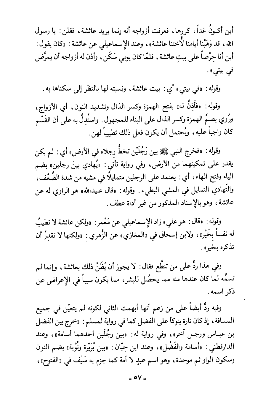 وفيه ردٌّ أيضًا على من زعم أنها أبهمت الثاني لكونه لم يتعيّن في جميع المسافة، إذ كان تارة يتوكأ على الفضل كما في رواية لمسلم: "خرج بين الفضل بن عباس ورجل آخر"، وفي رواية له: "بين رجُلَين أحدهما أسامة"، وعند الدارقطني: "أسامة والفَضْل"، وعند ابن حِبّان: "بين بُرَيْرة ونُوْبة" بضم النون وسكون الواو ثم موحدة، وهو اسم عبدٍ لا أمة كما جزم به سَيْف في "الفتوح"،