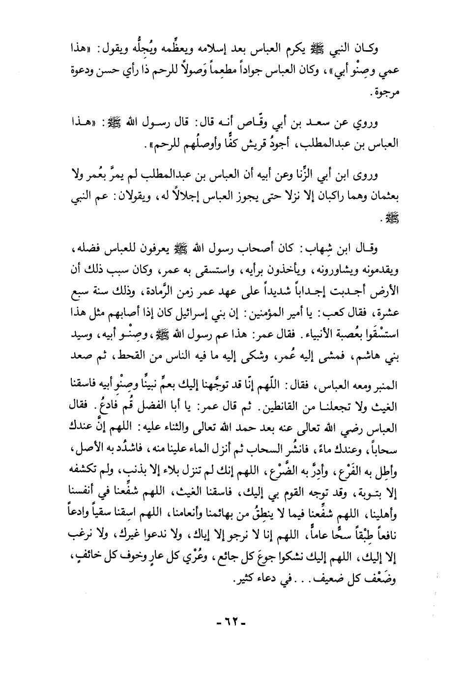 وقال ابن شِهاب: كان أصحاب رسول الله -صلى الله عليه وسلم- يعرفون للعباس فضله، ويقدمونه ويشاورونه، ويأخذون برأيه، واستسقى به عمر، وكان سبب ذلك أن الأرض أجدبت إجدابًا شديدًا على عهد عمر زمن الرَّمادة، وذلك سنة سبع عشرة، فقال كعب: يا أمير المؤمنين: إن بني إسرائيل كان إذا أصابهم مثل هذا استسْقَوا بعُصبة الأنبياء. فقال عمر: هذا عم رسول الله -صلى الله عليه وسلم-، وصِنْو أبيه، وسيد بني هاشم، فمشى إليه عُمر، وشكى إليه ما فيه الناس من القحط، ثم صعد المنبر ومعه العباس، فقال: اللهم إنّا قد توجَّهنا إليك بعمِّ نبينِّا وصِنْوِ أبيه فاسقنا الغيث ولا تجعلنا من القانطين. ثم قال عمر: يا أبا الفضل قُم فادعُ. فقال العباس رضي الله تعالى عنه بعد حمد الله تعالى والثناء عليه: اللهم إنَّ عندك سحابًا، وعندك ماءً، فانشُر السحاب ثم أنزل الماء علينا منه، فاشدُد به الأصل، وأطِل به الفَرْع، وأدِرَّ به الضَّرْع، اللهم إنك لم تنزل بلاء إلا بذنب، ولم تكشفه إلا بتوبة، وقد توجه القوم بي إليك، فاسقنا الغيث، اللهم شفِّعنا في أنفسنا وأهلينا، اللهم شفِّعنا فيما لا ينطِقُ من بهائمنا وأنعامنا، اللهم اسِقنا سقيًا وادعًا نافعًا طِبْقًا سحًّا عامًّا، اللهم إنا لا نرجو إلا إياك، ولا ندعوا غيرك، ولا نرغب إلا إليك، اللهم إليك نشكوا جوعَ كل جائع، وعُرْي كل عارٍ وخوف كل خائفٍ، وضَعْف كل ضعيف ... في دعاء كثير.