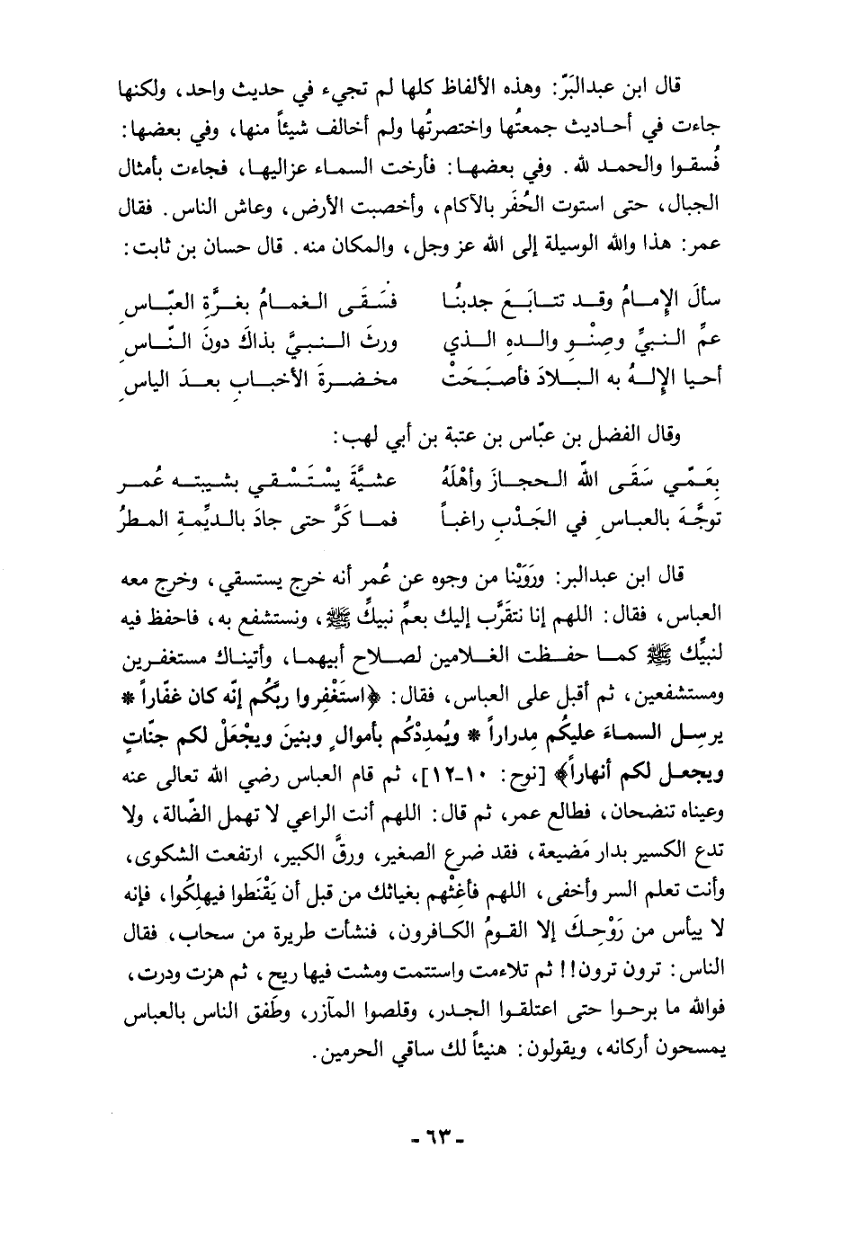 قال ابن عبد البر: ورَوينا من وجوه عن عُمر أنه خرج يستسقي، وخرج معه العباس، فقال: اللهم إنا نتقَرَّب إليك بعمِّ نبيك -صلى الله عليه وسلم-، ونستشفع به، فأحفظ فيه لنبيِّك -صلى الله عليه وسلم- كما حفظت الغلامين لصلاح أبيهما، وأتيناك مستغفرين ومستشفعين، ثم أقبل على العباس، فقال: {اسْتَغْفِرُوا رَبَّكُمْ إِنَّهُ كَانَ غَفَّارًا (10) يُرْسِلِ السَّمَاءَ عَلَيْكُمْ مِدْرَارًا (11) وَيُمْدِدْكُمْ بِأَمْوَالٍ وَبَنِينَ وَيَجْعَلْ لَكُمْ جَنَّاتٍ وَيَجْعَلْ لَكُمْ أَنْهَارًا (12)} نوح: [10 - 12]، ثم قام العباس رضي الله تعالى عنه وعيناه تنضحان، فطالع عمر، ثم قال: اللهم أنت الراعي لا تهمل الضّالة، ولا تدع الكسير بدار مَضيعة، فقد ضرع الصغير، ورقَّ الكبير، ارتفعت الشكوى، وأنت تعلم السر وأخفى، اللهم فأغِثْهم بغياثك من قبل أن يَقْنَطوا فيهلِكُوا، فإنه لا ييأس من رَوْحِكَ إلا القومُ الكافرون، فنشأت طريرة من سحاب، فقال الناس: ترون ترون!! ثم تلاءمت واستتمت ومشت فيها ريح، ثم هزت ودرت، فوالله ما برحوا حتى اعتلقوا الجدر، وقلصوا المآزر، وطَفق الناس بالعباس يمسحون أركانه، ويقولون: هنيئًا لك ساقي الحرمين.