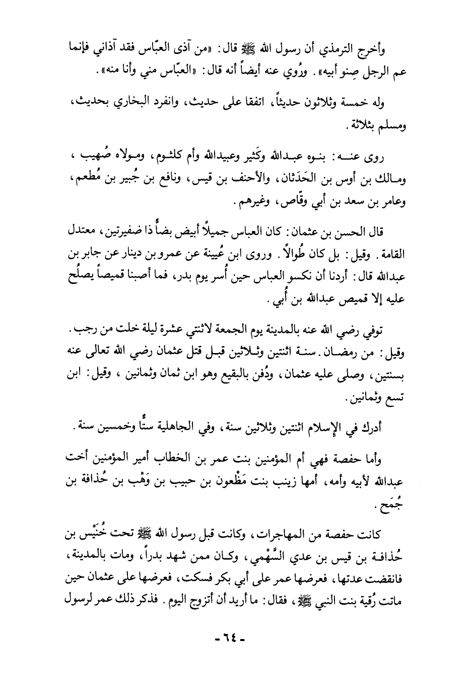وأخرج الترمذي أن رسول الله -صلى الله عليه وسلم- قال: "من آذى العبّاس فقد آذاني فإنما عم الرجل صِنو أبيه". ورُوي عنه أيضًا أنه قال: "العبّاس مني وأنا منه".