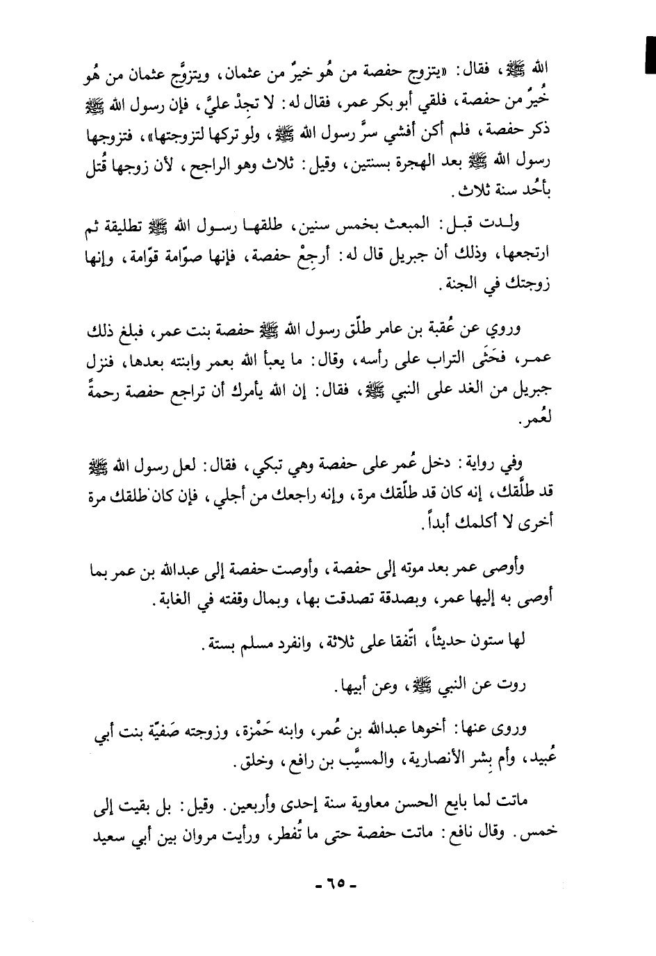 ولدت قبل: المبعث بخمس سنين، طلقها رسول الله -صلى الله عليه وسلم- تطليقة ثم ارتجعها، وذلك أن جبريل قال له: أرجعْ حفصة، فإنها صوّامة قوّامة، وإنها زوجتك في الجنة.