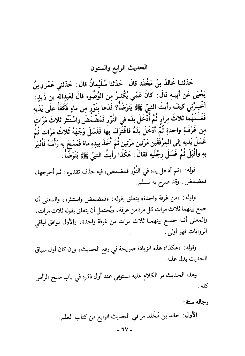حَدَّثَنَا خَالِدُ بْنُ مَخْلَدٍ قَالَ: حَدَّثَنَا سُلَيْمَانُ قَالَ: حَدَّثَنِي عَمْرُو بْنُ يَحْيَى عَنْ أَبِيهِ قَالَ: كَانَ عَمِّي يُكْثِرُ مِنَ الْوُضُوءِ، قَالَ لِعَبْدِ اللَّهِ بْنِ زَيْدٍ أَخْبِرْنِي كَيْفَ رَأَيْتَ النَّبِيَّ -صلى الله عليه وسلم- يَتَوَضَّأُ؟ فَدَعَا بِتَوْرٍ مِنْ مَاءٍ، فَكَفَأَ عَلَى يَدَيْهِ فَغَسَلَهُمَا ثَلاَثَ مِرَارٍ، ثُمَّ أَدْخَلَ يَدَهُ فِي التَّوْرِ، فَمَضْمَضَ وَاسْتَنْثَرَ ثَلاَثَ مَرَّاتٍ مِنْ غَرْفَةٍ وَاحِدَةٍ، ثُمَّ أَدْخَلَ يَدَهُ فَاغْتَرَفَ بِهَا فَغَسَلَ وَجْهَهُ ثَلاَثَ مَرَّاتٍ، ثُمَّ غَسَلَ يَدَيْهِ إِلَى الْمِرْفَقَيْنِ مَرَّتَيْنِ مَرَّتَيْنِ، ثُمَّ أَخَذَ بِيَدِهِ مَاءً، فَمَسَحَ رَأْسَهُ، فَأَدْبَرَ بِيَدَيْهِ وَأَقْبَلَ ثُمَّ غَسَلَ رِجْلَيْهِ، فَقَالَ هَكَذَا رَأَيْتُ النَّبِيَّ -صلى الله عليه وسلم- يَتَوَضَّأُ.