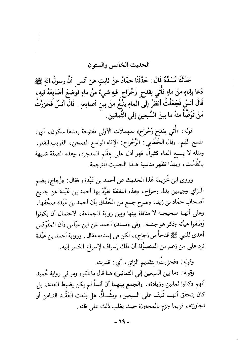 حَدَّثَنَا مُسَدَّدٌ قَالَ: حَدَّثَنَا حَمَّادٌ عَنْ ثَابِتٍ عَنْ أَنَسٍ أَنَّ رسولَ اللهِ -صلى الله عليه وسلم- دَعَا بِإِنَاءٍ مِنْ مَاءٍ، فَأُتِيَ بِقَدَحٍ رَحْرَاحٍ فِيهِ شَيْءٌ مِنْ مَاءٍ، فَوَضَعَ أَصَابِعَهُ فِيهِ. قَالَ أَنَسٌ فَجَعَلْتُ أَنْظُرُ إِلَى الْمَاءِ يَنْبُعُ مِنْ بَيْنِ أَصَابِعِهِ، قَالَ أَنَسٌ فَحَزَرْتُ مَنْ تَوَضَّأَ مَا بَيْنَ السَّبْعِينَ إِلَى الثَّمَانِينَ.