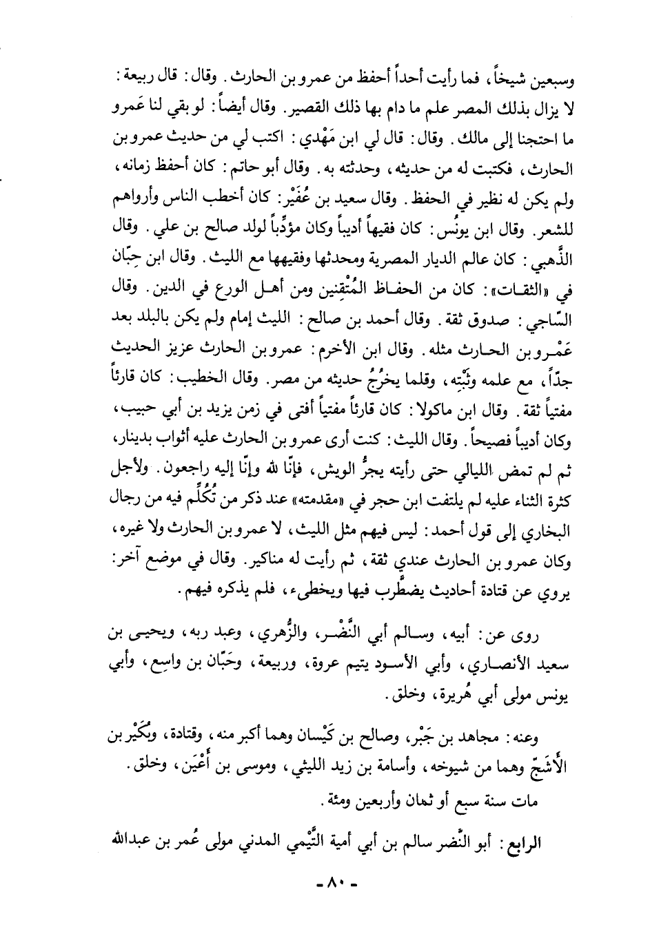 وسبعين شيخًا، فما رأيت أحدًا أحفظ من عمرو بن الحارث. وقال: قال ربيعة: لا يزال بذلك العصر علم ما دام بها ذلك القصير. وقال أيضًا: لو بقي لنا عَمرو ما احتجنا إلى مالك. وقال: قال لي ابن مَهْدي: اكتب لي من حديث عمرو بن الحارث، فكتبت له من حديثه، وحدثته به. وقال أبو حاتم: كان أحفظ زمانه، ولم يكن له نظير في الحفظ. وقال سعيد بن عُفَيْر. كان أخطب الناس وأرواهم للشعر. وقال ابن يونُس: كان فقيهًا أديبًا وكان مؤدِّبًا لولد صالح بن علي. وقال الذَّهبي: كان عالم الديار المصرية ومحدثها وفقيهها مع الليث. وقال ابن حِبّان في "الثقات": كان من الحفاظ المُتْقِنين ومن أهل الورع في الدين. وقال السّاجي: صدوق ثقة. وقال أحمد بن صالح: الليث إمام ولم يكن بالبلد بعد عَمْرو بن الحارث مثله. وقال ابن الأخرم: عمرو بن الحارث عزيز الحديث جدًّا، مع علمه وثَبْتِه، وقلما يخرُجُ حديثه من مصر. وقال الخطيب: كان قارئًا مفتيًا ثقة. وقال ابن ماكولا: كان قارئًا مفتيًا أفتى في زمن يزيد بن أبي حبيب، وكان أديبًا فصيحًا. وقال الليث: كنت أرى عمرو بن الحارث عليه أثواب بدينار، ثم لم تمض الليالي حتى رأيته يجرُّ الويش، فإنّا لله وإنّا إليه راجعون. ولأجل كثرة الثناء عليه لم يلتفت ابن حجر في "مقدمته" عند ذكر من تُكُلِّم فيه من رجال البخاري إلى قول أحمد: ليس فيهم مثل الليث، لا عمرو بن الحارث ولا غيره، وكان عمرو بن الحارث عندي ثقة، ثم رأيت له مناكير. وقال في موضع آخر: يروي عن قتادة أحاديث يضطَّرب فيها ويخطىء، فلم يذكره فيهم.