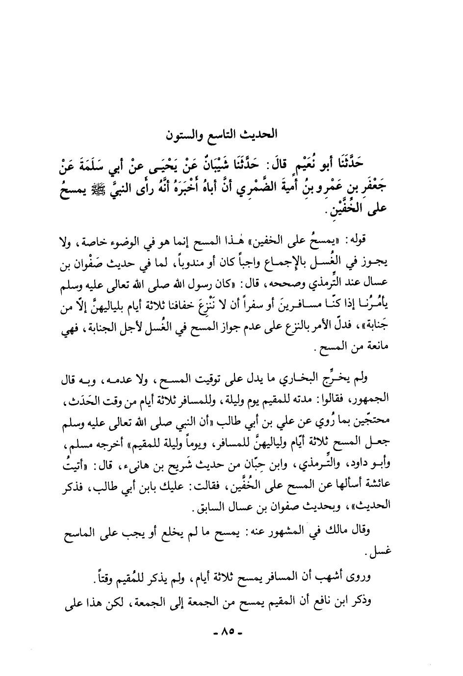 قوله: "يمسحُ على الخفين" هذا المسح إنما هو في الوضوء خاصة، ولا يجوز في الغُسل بالإجماع واجبًا كان أو مندوبًا، لما في حديث صَفْوان بن عسال عند التِّرمذي وصححه، قال: "كان رسول الله صلى الله تعالى عليه وسلم يأمُرُنا إذا كنّا مسافرينَ أو سفرًا أن لا نَنْزِعَ خفافنا ثلاثة أيام بلياليهنَّ إلاَّ من جَنابة"، فدلّ الأمر بالنزع على عدم جواز المسح في الغُسل لأجل الجنابة، فهي مانعة من المسح.