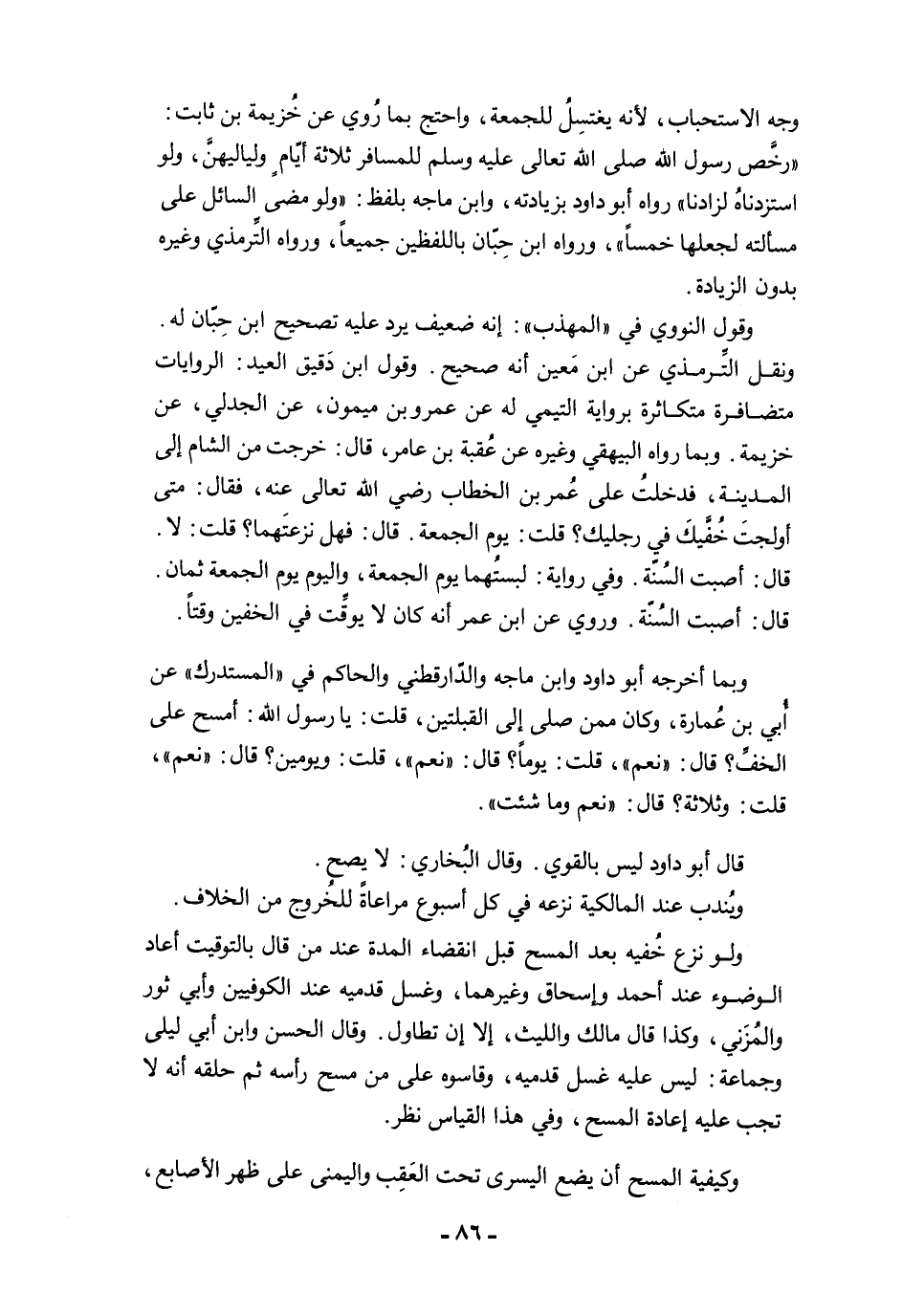 وقول النووي في "المهذب": إنه ضعيف يرد عليه تصحيح ابن حِبّان له. ونقل التِّرمذي عن ابن مَعين أنه صحيح. وقول ابن دَقيق العيد: الروايات متضافرة متكاثرة برواية التيمي له عن عمرو بن ميمون، عن الجدلي، عن خزيمة. وبما رواه البيهقي وغيره عن عُقبة بن عامر، قال: خرجت من الشام إلى المدينة، فدخلتُ على عُمر بن الخطاب رضي الله تعالى عنه، فقال: متى أولجتَ خُفَّيكَ في رجليك؟ قلت: يوم الجمعة. قال: فهل نزعتَهما؟ قلت: لا. قال: أصبت السُنّة. وفي رواية: لبستُهما يوم الجمعة، واليوم يوم الجمعة ثمان. قال: أصبت السُنّة. وروي عن ابن عمر أنه كان لا يوقَّت في الخفين وقتًا.