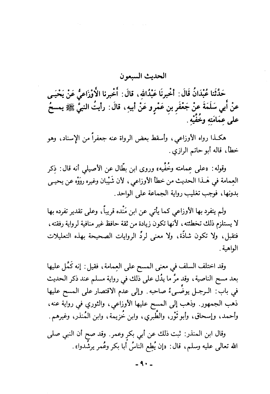 وقوله: "على عِمامته وخُفَّيه" وروى ابن بطّال عن الأصيلي أنه قال: ذِكر العِمامة في هذا الحديث من خطأ الأوزاعي؛ لأن شَيْبان وغيره روَوْه عن يحيى بدونها، فوجب تغليب رواية الجماعة على الواحد.