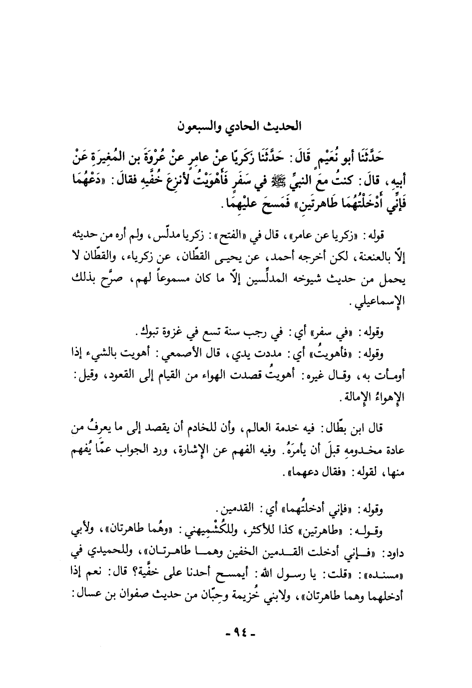 حَدَّثَنَا أَبُو نُعَيْمٍ قَالَ: حَدَّثَنَا زَكَرِيَّاءُ عَنْ عَامِرٍ عَنْ عُرْوَةَ بْنِ الْمُغِيرَةِ عَنْ أَبِيهِ، قَالَ: كُنْتُ مَعَ النَّبِيِّ -صلى الله عليه وسلم- فِي سَفَرٍ، فَأَهْوَيْتُ لأَنْزِعَ خُفَّيْهِ فَقَالَ: "دَعْهُمَا، فَإِنِّي أَدْخَلْتُهُمَا طَاهِرَتَيْنِ". فَمَسَحَ عَلَيْهِمَا.