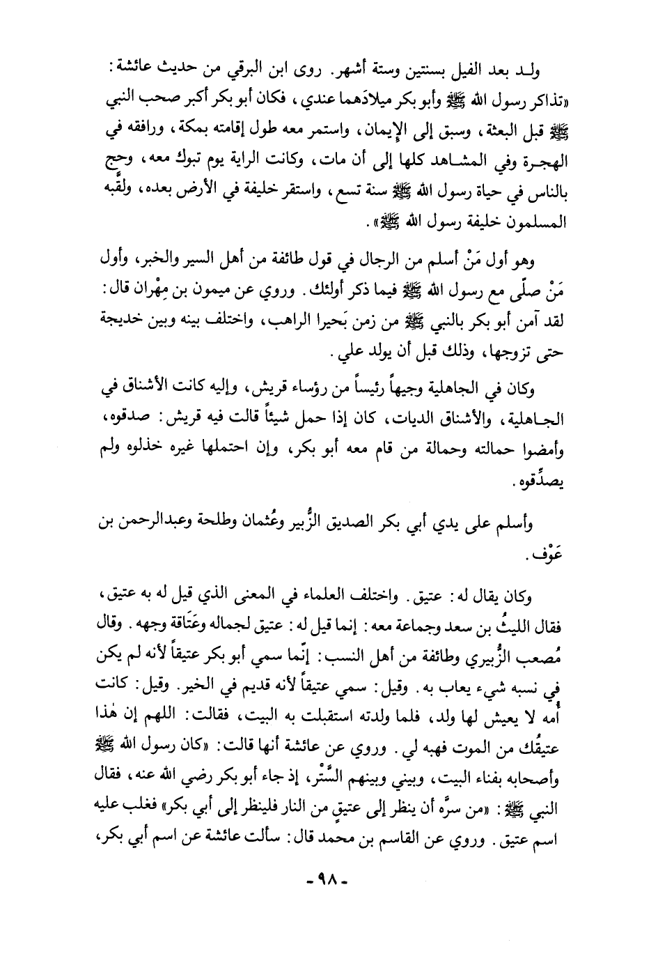 وهو أول مَنْ أسلم من الرجال فى قول طائفة من أهل السير والخبر، وأول مَنْ صلّى مع رسول الله -صلى الله عليه وسلم- فيما ذكر أولئك. وروي عن ميمون بن مِهْران قال: لقد آمن أبو بكر بالنبي -صلى الله عليه وسلم- من زمن بَحيرا الراهب، واختلف بينه وبين خديجة حتى تزوجها، وذلك قبل أن يولد علي.