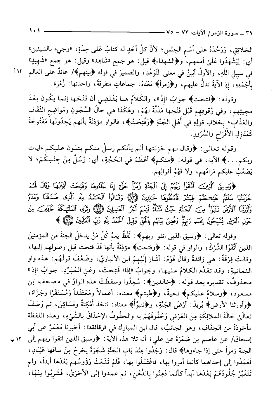 وقوله تعالى: وَسِيقَ الَّذِينَ اتَّقَوْا رَبَّهُمْ: لَفْظٌ يعمُّ كُلَّ مَنْ يدخلُ الجنةَ من المؤمنينَ الذين اتقوا الشِّرْكَ، والواو في قوله: وَفُتِحَتْ مؤذِنَةٌ بأنها قَدْ فتحت قبل وصولهِم إليها، وقالتْ فِرْقَةٌ: هي زائدةٌ وقالَ قَوْمٌ: أشَارَ إلَيْهِمُ ابن الأنباريِّ، وضَعَّفَ قولَهُم: هذه واو الثمانيةِ، وقد تقدَّم الكلامُ عليها، وجَوابُ «إذا» فُتِحَتْ، وعَنِ المُبَرِّدِ: جوابُ «إذا» محذوفٌ، تقديره بعد قوله: خالِدِينَ: سُعِدُوا وسقطَتْ هذه الواوُ في مصحف ابن مسعود، وسَلامٌ عَلَيْكُمْ تحيةٌ، وطِبْتُمْ معناه: أعمالاً ومُعْتَقَداً وَمُسْتَقَرّاً وجَزَاءً، وَأَوْرَثَنَا الْأَرْضَ يريد: أرض الجنّة، ونَتَبَوَّأُ معناه: نتخذ أَمْكِنَةٌ ومَسَاكِنَ، ثم وَصَفَ تعالى حَالَةَ الملائِكَةِ مِنَ العَرْشِ وَحُفُوفَهُمْ به والحفُوفُ الإحْدَاقُ بالشَّيْءِ، وهذه اللفظة مأخوذةٌ من الحِفَافِ، وهو الجانبُ، قال ابن المبارِك في «رقائقه» : أخبرنا مَعْمَرٌ عن أبي إسحاق/ عن عاصم بن ضَمْرَةَ عن علي أنه تلا هذه الآية: وَسِيقَ الَّذِينَ اتَّقَوْا رَبَّهُمْ إِلَى الْجَنَّةِ زُمَراً حَتَّى إِذا جاؤُها