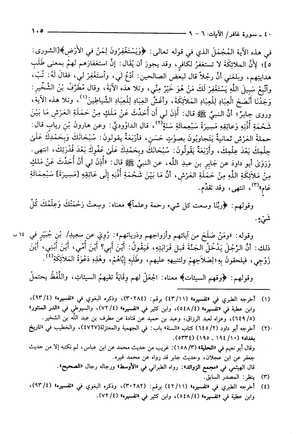 5] لأَنَّ الملائِكَةَ لا تستغفرُ لكافرٍ، وقد يجوز أن يُقَال: إنَّ استغفارَهم لهمُ بمعنى طَلَبِ هدايتِهم، وبلغني أنَّ رجُلاً قال لبعض الصالحين: ادع لي، واستغفر لي، فقالَ لَهُ: تُبْ، واتبع سَبِيلَ اللَّهِ يَسْتَغْفِرْ لَكَ مَنْ هُوَ خَيْرٌ مِنِّي، وتلا هذه الآيَةَ، وقال مُطَرِّفُ بْنُ الشِّخِّيرِ: