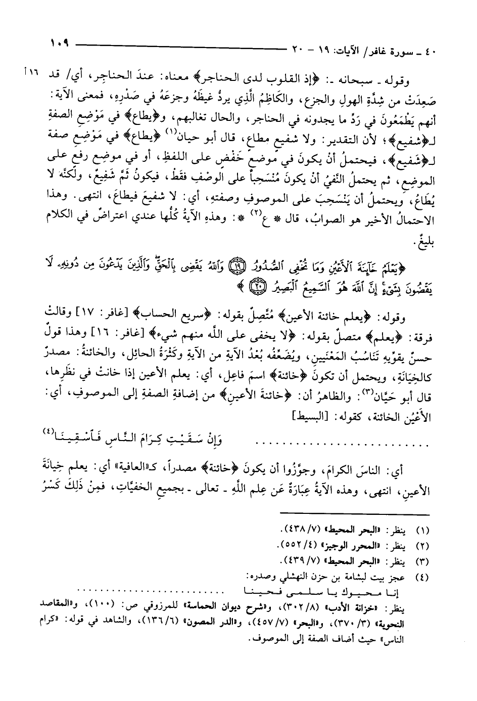 أنهم يَطْمَعُونَ في رَدِّ ما يجدونه في الحناجر، والحال تغالبهم، ويُطاعُ في مَوْضِعِ الصفةِ ل شَفِيعٍ لأن التقدير: ولا شفيعٍ مطاعٍ، قال أبو حيان «1» يُطاعُ في مَوْضِعِ صفة ل شَفِيعٍ، فيحتملُ أنْ يكونَ في موضعِ خَفْضٍ على اللفظِ، أو في موضِع رفعٍ على الموضِعِ، ثم يحتملُ النَّفيُ أنْ يكونَ مُنْسَحِباً على الوصْفِ فقَطْ، فيكونُ ثَمَّ شَفِيعٌ، ولكنَّه لا يُطَاعُ، ويحتملُ أن يَنْسَحِبَ على الموصوفِ وصفتهِ، أي: لا شفيعَ فيطاعَ، انتهى. وهذا الاحتمالُ الأخير هو الصوابُ، قال ع «2» : وهذهِ الآيةُ كُلُّها عندي اعتراض في الكلام بليغ.