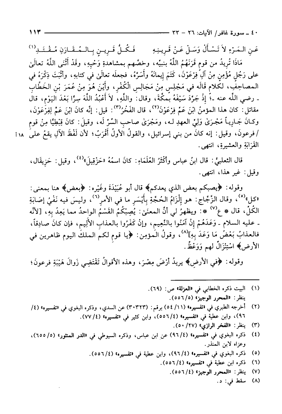 مَاذَا تُرِيدُ من قومٍ قَرَنَهُمُ اللَّهُ بنبيِّه، وخصَّهم بمشاهدةِ وَحْيِهِ، وقَدْ أَثْنَى اللَّهُ تعالى على رَجُلٍ مُؤْمِنٍ مِنْ آلِ فِرْعَوْنَ، كَتَمَ إيمانَهُ وأَسَرَّهُ، فجعلَه تعالى في كتابهِ، وأثْبَتَ ذِكْرَهُ في المصاحِفِ، لكلامٍ قَالَه في مَجْلِسٍ مِنْ مَجَالِسِ الْكُفْرِ، وأَيْنَ هُوَ مِنْ عُمَرَ بْنِ الخَطَّابِ- رضي اللَّه عنه- إذْ جَرَّدَ سَيْفَهُ بمكَّةَ، وقال: واللَّهِ، لاَ أَعْبُدُ اللَّهَ سِرًّا بَعْدَ اليَوْمِ، قال مقاتل: كان هذا المؤمنُ ابْنَ عَمِّ فِرْعَوْنَ «2» ، قال الفَخْرُ «3» : قيل: إنَّه كانَ ابْنَ عَمٍّ لِفِرْعَوْنَ، وكانَ جَارِياً مجرى وَلِيِّ العهدِ له، ومجرى صاحبِ السِّرِّ لَه، وقيلَ: كانَ قِبْطِيًّا مِنْ قومِ/ فرعونَ، وقيل: إنه كانَ من بني إسرائيل، والقولُ الأولُ أَقْرَبُ لأن لَفْظَ الآلِ يقعُ على القَرَابَةِ والعشيرةِ، انتهى.