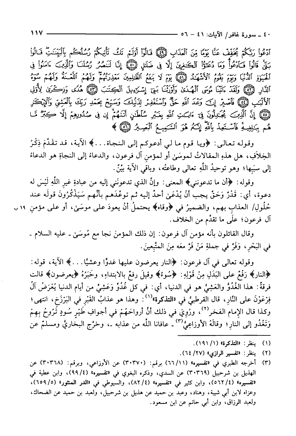 النَّارُ رَفْعٌ على البَدَلِ مِنْ قَوْلِهِ: سُوءُ وقيلَ رفعٌ بالابتداءِ، وخَبَرُهُ يُعْرَضُونَ قالت فرقةٌ: هذا الغُدُوُّ والعَشِيُّ هو في الدنيا، أي: في كل غُدُوٍّ وَعَشِيٍّ من أيام الدنيا يُعْرَضُ آلُ فِرْعَوْنَ على النَّارِ، قال القرطبيُّ في «التذكرة» «1» : وهذا هو عذابُ القَبْرِ في البَرْزَخِ، انتهى وكذا قال الإمام الفخر «2» ، ورُوِيَ في ذلك أنَّ أرواحَهُمْ في أجوافِ طَيْرٍ سُودٍ تَرُوحُ بِهِمْ وَتَغْدُو إلى النارِ وقالَهُ الأوزاعِيُّ «3» - عافانا اللَّه من عذابه-، وخرَّج البخاريُّ ومسلم عن