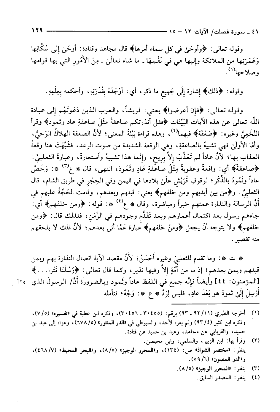 وقوله تعالى: فَإِنْ أَعْرَضُوا يعني: قريشاً، والعرب الذين دَعَوتَهُم إلى عبادة اللَّه تعالى عن هذه الآيات البَيِّنَات فَقُلْ أَنْذَرْتُكُمْ صاعِقَةً مِثْلَ صاعِقَةِ عادٍ وَثَمُودَ وقرأ النّخعي وغيره: صعقة فيهما «2» ، وهذه قراءة بَيِّنَةُ المعنى لأنَّ الصعقة الهلاكُ الوَحيُّ، وأمَّا الأولى فهي تشبيهٌ بالصاعقةِ، وهي الوقعة الشديدة من صوت الرعد، فشُبِّهَتْ هنا وقعةُ العذاب بها لأنَّ عاداً لم تُعَذَّبْ إلاَّ بِرِيحٍ، وإنَّما هذا تشبيهٌ واستعارة، وعبارةُ الثعلبيِّ: