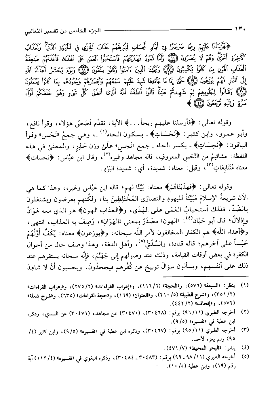 وقوله تعالى: فَأَرْسَلْنا عَلَيْهِمْ رِيحاً ... الآية، تقدَّم قَصَصُ هؤلاء، وقرأ نافع، وأبو عمرو، وابن كثير: نَحِساتٍ- بسكون الحاء «1» -، وهي جمعُ «نَحْس» وقرأ الباقون: نَحِساتٍ- بكسر الحاء- جمع «نَحِسٍ» على وزن حَذِرٍ، والمعنى في هذه اللفظة: مشائيم من النَّحْسِ المعروفِ، قاله مجاهد وغيره «2» ، وقال ابن عبَّاس: نَحِساتٍ معناه مُتَتَابِعَاتٍ «3» ، وقيل: معناه: شديدة، أي: شديدة البَرْدِ.
