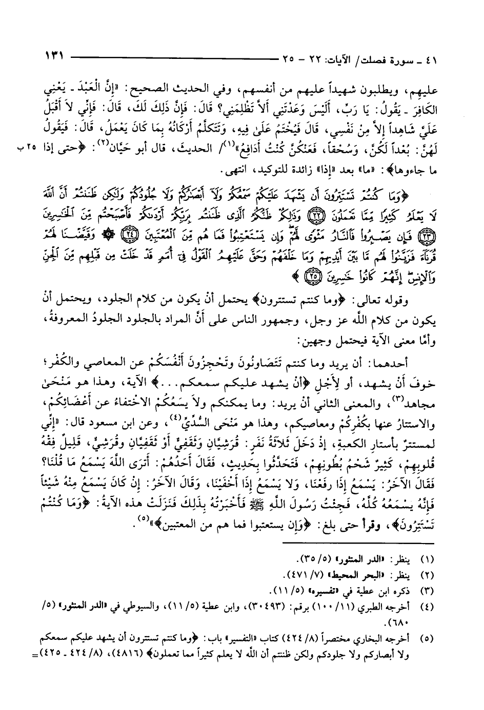(5) أخرجه البخاري مختصرا (8/ 424) كتاب «التفسير» باب: وَما كُنْتُمْ تَسْتَتِرُونَ أَنْ يَشْهَدَ عَلَيْكُمْ سَمْعُكُمْ وَلا أَبْصارُكُمْ وَلا جُلُودُكُمْ وَلكِنْ ظَنَنْتُمْ أَنَّ اللَّهَ لا يَعْلَمُ كَثِيراً مِمَّا تَعْمَلُونَ (4816) ، (8/ 424- 425) -
