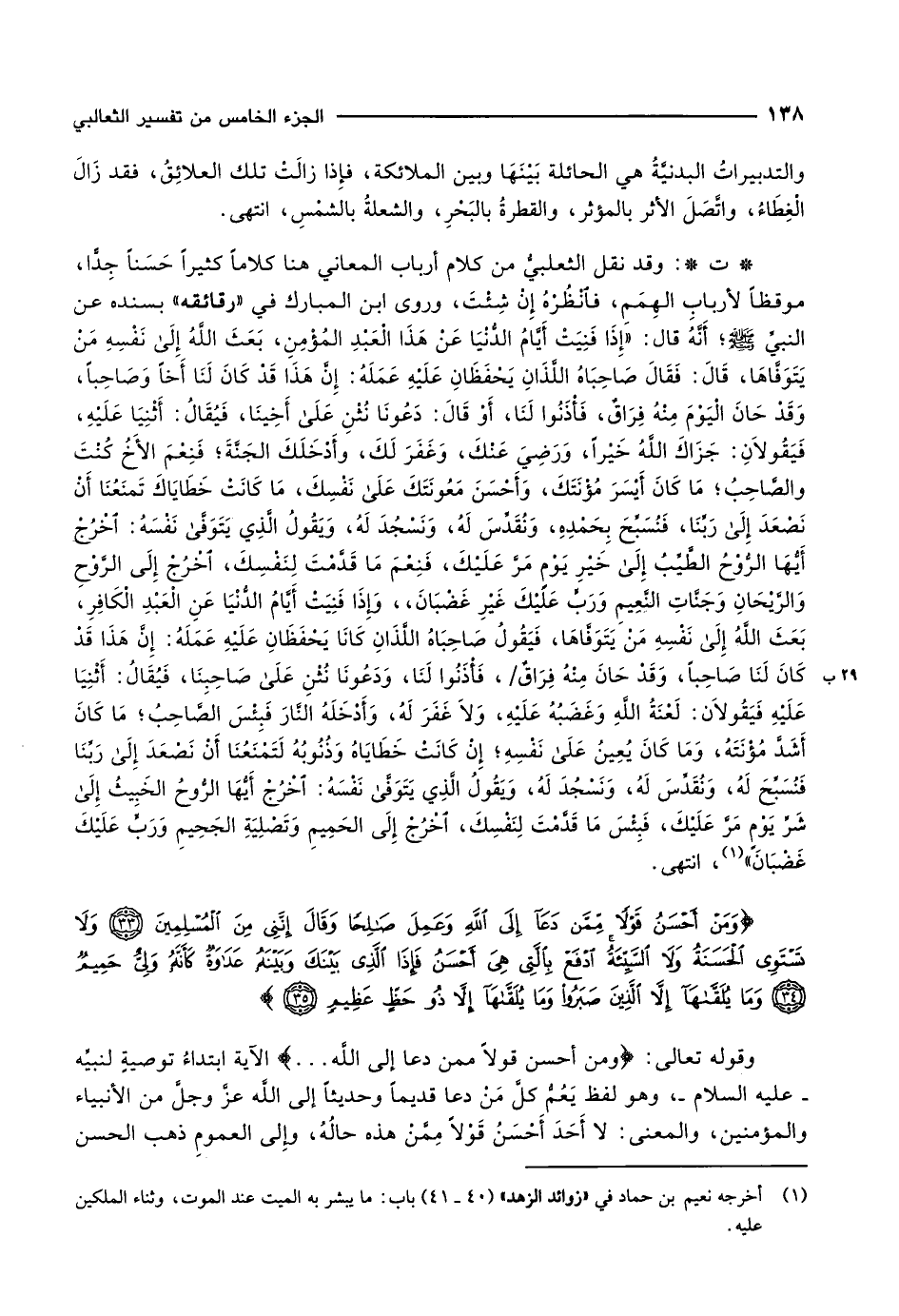ت: وقد نقل الثعلبيُّ من كلام أرباب المعاني هنا كلاماً كثيراً حَسَناً جِدًّا، موقظاً لأربابِ الهِمَمِ، فانظره إنْ شِئْتَ، وروى ابن المبارك في «رقائقه» بسنده عن النبي صلّى الله عليه وسلّم أنّه قال: «إذَا فَنِيَتْ أَيَّامُ الدُّنْيَا عَنْ هَذَا الْعَبْدِ المُؤْمِنِ، بَعَثَ اللَّهُ إلى نَفْسِهِ مَنْ يَتَوَفَّاهَا، قَالَ: فَقَالَ صَاحِبَاهُ اللَّذَانِ يَحْفَظَانِ عَلَيْهِ عمله: إنّ هذا قد كان لَنَا أَخاً وَصَاحِباً، وَقَدْ حَانَ الْيَوْمَ مِنْهُ فِرَاقٌ، فَأْذَنُوا لَنَا، أَوْ قَالَ: دَعُونَا نُثْنِ على أَخِينَا، فَيُقَالُ: أَثْنِيَا عَلَيْهِ، فَيَقُولاَنِ: جَزَاكَ اللَّهُ خَيْراً، وَرَضِيَ عَنْكَ، وَغَفَرَ لَكَ، وأَدْخَلَكَ الجَنَّةَ فَنِعْمَ الأَخُ كُنْتَ والصَّاحِبُ مَا كَانَ أَيْسَرَ مُؤْنَتَكَ، وَأَحْسَنَ مَعُونَتَكَ على نَفْسِكَ، مَا كَانَتْ خَطَايَاكَ تَمنَعُنَا أَنْ نَصْعَدَ إلى رَبِّنَا، فَنُسَبِّحَ بِحَمْدِهِ، وَنُقَدِّسَ لَهُ، وَنَسْجُدَ لَهُ، وَيَقُولُ الَّذِي يتوفى نَفْسَهُ: اخرج أَيُّهَا الرُّوْحُ الطَّيِّبُ إلى خَيْرِ يَوْمٍ مَرَّ عَلَيْكَ، فَنِعْمَ مَا قَدَّمْتَ لِنَفْسِكَ، اخرج إلَى الرَّوْحِ وَالرَّيْحَانِ وَجَنَّاتِ النعيم وربّ عليك غير غضبان، وفنيت أَيَّامُ الدُّنْيَا عَنِ الْعَبْدِ الْكَافِرِ، بَعَثَ اللَّهُ إلى نَفْسِهِ مَنْ يَتَوَفَّاهَا، فَيَقُولُ صَاحِبَاهُ اللَّذَانِ كَانَا يَحْفَظَانِ عَلَيْهِ عَمَلَهُ: إنَّ هَذَا قَدْ كَانَ لَنَا صَاحِباً، وَقَدْ حَانَ مِنْهُ فِرَاقٌ/، فَأْذَنُوا لَنَا، وَدَعُونَا نُثْنِ على صَاحِبِنَا، فَيُقَالُ: أَثْنِيَا عَلَيْهِ فَيَقُولاَن: لَعْنَةُ اللَّهِ وَغَضَبُهُ عَلَيْهِ، وَلاَ غَفَرَ لَهُ، وَأَدْخَلَهُ النَّارَ فَبِئْسَ الصَّاحِبُ ما كان أشدّ مؤنته، ونقدّس ما كَانَ يُعِينُ على نَفْسِهِ إنْ كَانَتْ خَطَايَاهُ وَذُنُوبُهُ لَتَمْنَعُنَا أَنْ نَصْعَدَ إلى رَبِّنَا فَنُسَبِّحَ لَهُ، وَنُقَدِّسَ لَهُ، وَنَسْجُدَ لَهُ، وَيَقُولُ الَّذِي يتوفى نَفْسَهُ: اخرج أَيُّهَا الرُّوحُ الخَبِيثُ إلى شَرِّ يَوْمٍ مَرَّ عَلَيْكَ، فَبِئْسَ مَا قَدَّمْتَ لِنَفْسِكَ، اخرج إلَى الحَمِيمِ وَتَصْلِيَةِ الجَحِيمِ وَرَبٍّ عليك غضبان» «1» ، انتهى.