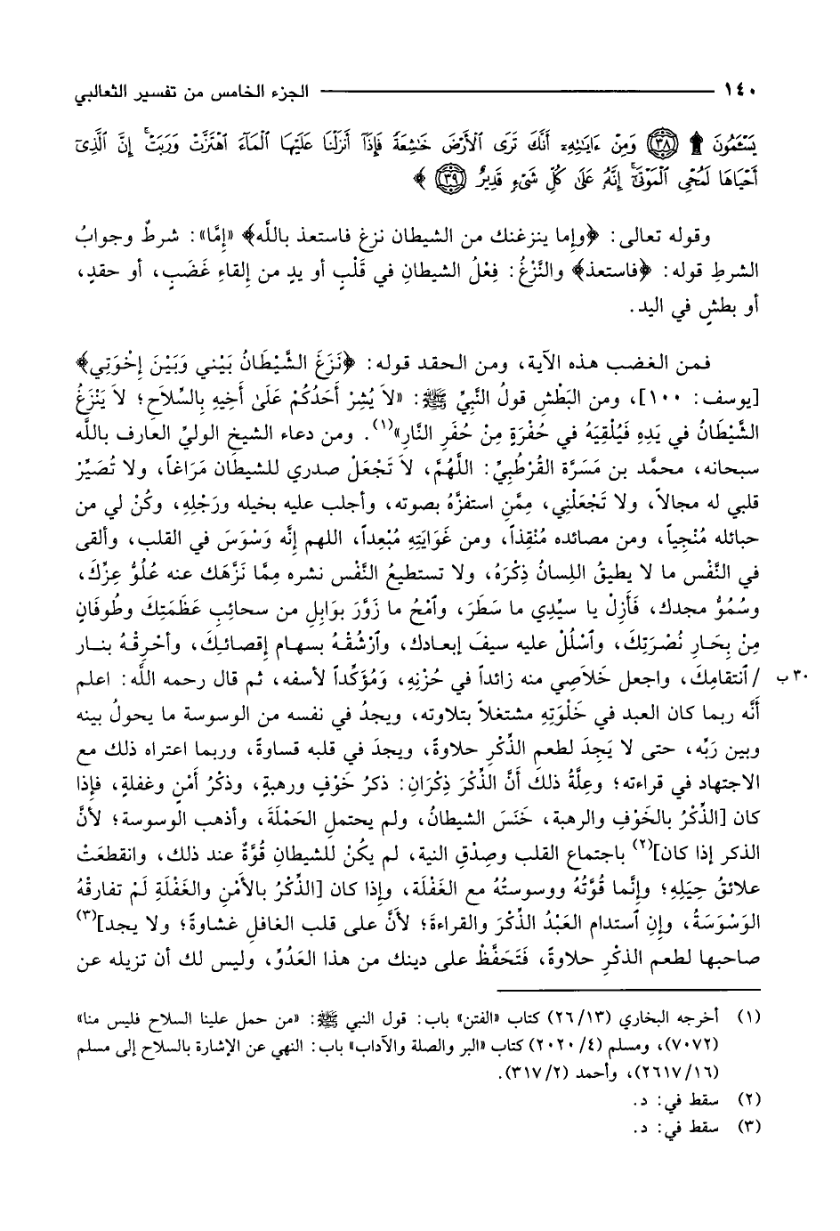 وقوله تعالى: وَإِمَّا يَنْزَغَنَّكَ مِنَ الشَّيْطانِ نَزْغٌ فَاسْتَعِذْ بِاللَّهِ «إِمَّا» : شرطٌ وجوابُ الشرطِ قوله: فَاسْتَعِذْ والنَّزْغُ: فِعْلُ الشيطانِ في قَلْبٍ أو يدٍ من إلقاءِ غَضَبٍ، أو حقدٍ، أو بطشٍ في اليد.