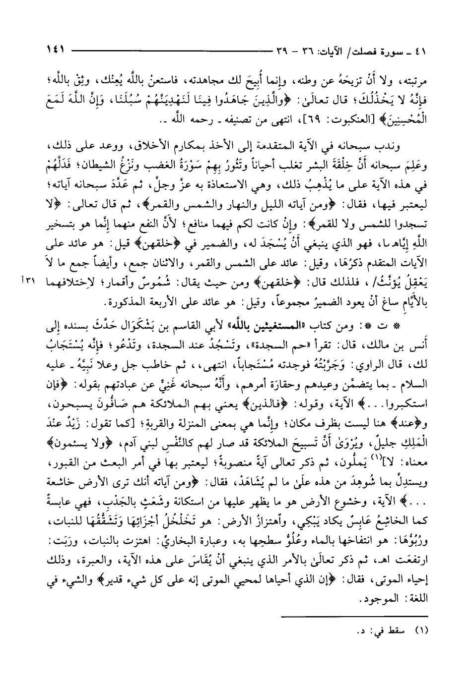 ت: ومن كتاب «المستغيثين باللَّه» لأبي القاسم بن بَشْكَوَال حَدَّثَ بسنده إلى أَنس بن مالك، قال: تقرأ «حم السجدة» ، وتَسْجُدُ عند السجدة، وتَدْعُو فإنَّه يُسْتَجَابُ لك، قال الراوي: وَجَرَّبْتُهُ فوجدته مُسْتَجاباً، انتهى،، ثم خاطب جل وعلا نَبِيَّهُ- عليه السلام- بما يتضمَّن وعيدهم وحقارَة أمرهم، وأَنَّهُ سبحانه غَنِيٌّ عن عبادتهم بقوله: فَإِنِ اسْتَكْبَرُوا ... الآية، وقوله: فَالَّذِينَ يعني بهم الملائكة هم صَافُّونَ يسبحون، وعِنْدَ هنا ليست بظرف مكان وإِنَّما هي بمعنى المنزلة والقربةِ [كما تقول: زَيْدٌ عنْدَ الْمَلِكِ جليلٌ، ويروى أَنَّ تَسبيحَ الملائكة قد صار لهم كالنّفس لبني آدم، وَهُمْ لا يَسْأَمُونَ معناه: لا] «1» يَملُّون، ثم ذكر تعالى آيةً منصوبةً ليعتبر بها في أمر البعث من القبور، ويستدِلَّ بما شُوهِدَ من هذه على ما لم يشاهد، فقال: وَمِنْ آياتِهِ أَنَّكَ تَرَى الْأَرْضَ خاشِعَةً ... الآية، وخشوع الأرض هو ما يظهر عليها من استكانة وشَعَثٍ بالجَدْبِ، فهي عابسةٌ كما الخاشِعُ عَابِسٌ يكاد يَبْكِي، واهتزاز الأرض: هو تَخَلْخُلُ أجْزَائِهَا وَتَشَقُّقُهَا للنبات، ورُبُوُّهَا: هو انتفاخها بالماء وعُلُوُّ سطحِها به، وعبارة البخاريِّ: اهتزت بالنبات، ورَبَت: