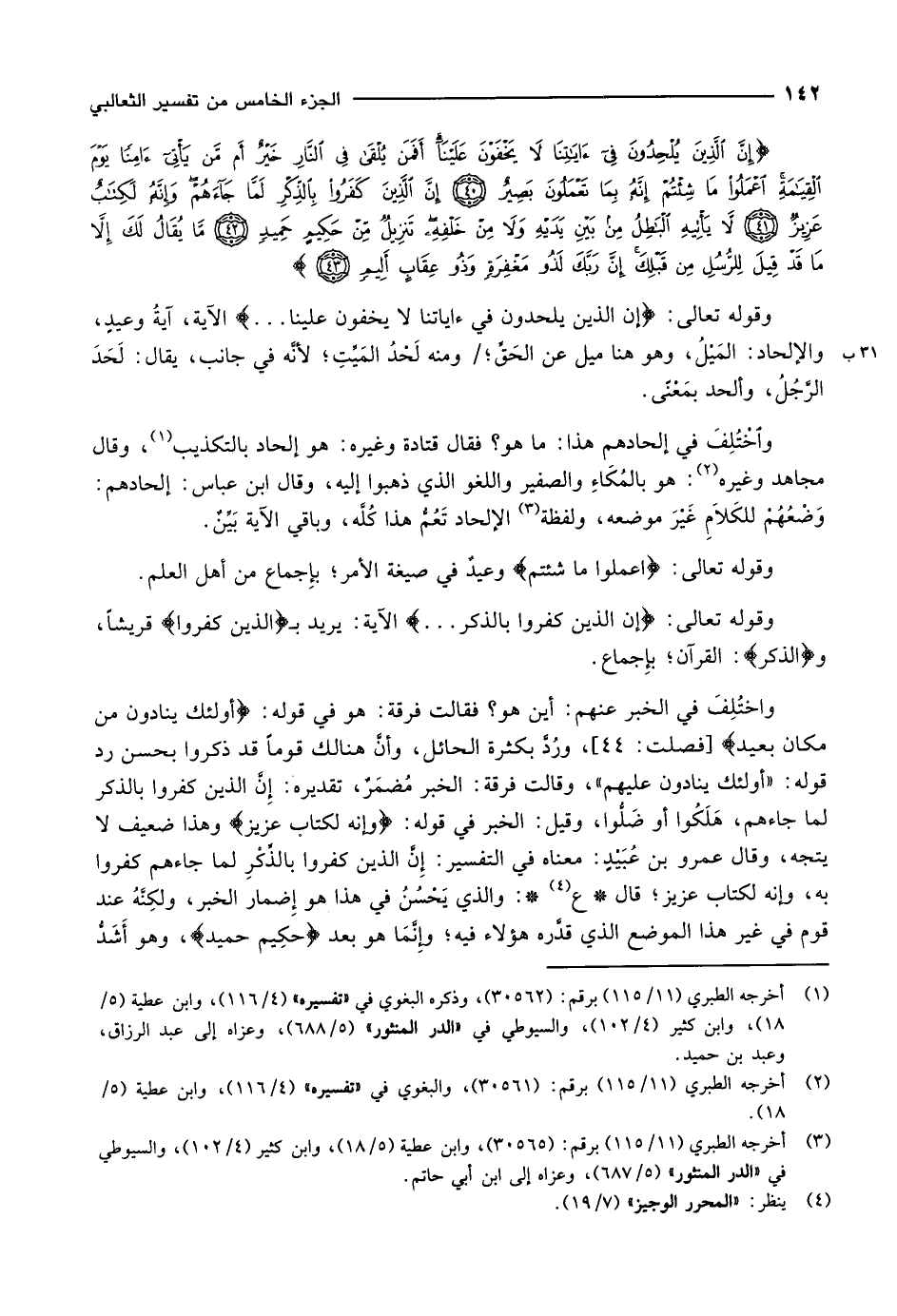 وقوله تعالى: إِنَّ الَّذِينَ يُلْحِدُونَ فِي آياتِنا لاَ يَخْفَوْنَ عَلَيْنا ... الآية، آيةُ وعيدٍ، والإلحاد: المَيْلُ، وهو هنا ميل عن الحَقِّ/ ومنه لَحْدُ المَيِّتِ لأنَّه في جانب، يقال: لَحَدَ الرَّجُلُ، وألحد بمَعْنًى.