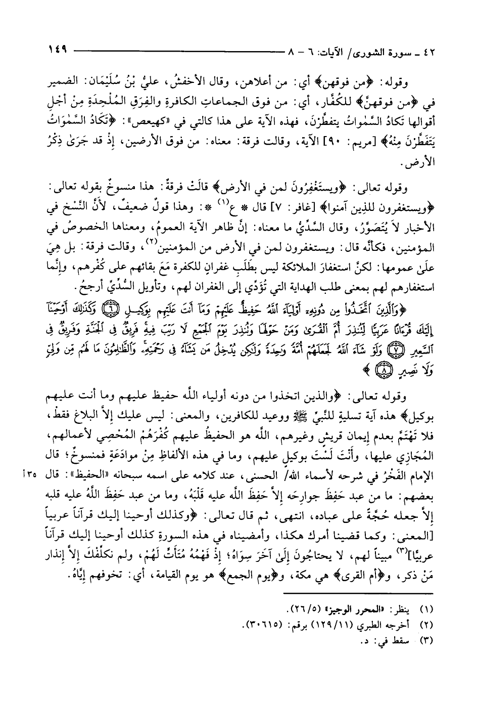 وَالَّذِينَ اتَّخَذُوا مِنْ دُونِهِ أَوْلِياءَ اللَّهُ حَفِيظٌ عَلَيْهِمْ وَما أَنْتَ عَلَيْهِمْ بِوَكِيلٍ (6) وَكَذلِكَ أَوْحَيْنا إِلَيْكَ قُرْآناً عَرَبِيًّا لِتُنْذِرَ أُمَّ الْقُرى وَمَنْ حَوْلَها وَتُنْذِرَ يَوْمَ الْجَمْعِ لا رَيْبَ فِيهِ فَرِيقٌ فِي الْجَنَّةِ وَفَرِيقٌ فِي السَّعِيرِ (7) وَلَوْ شاءَ اللَّهُ لَجَعَلَهُمْ أُمَّةً واحِدَةً وَلكِنْ يُدْخِلُ مَنْ يَشاءُ فِي رَحْمَتِهِ وَالظَّالِمُونَ ما لَهُمْ مِنْ وَلِيٍّ وَلا نَصِيرٍ (8)